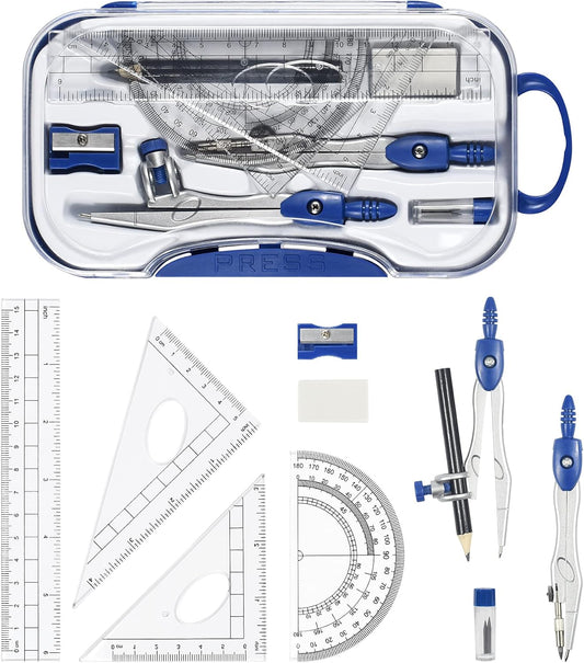Math Geometry Kit Sets 10 Piece Student Supplies with Shatterproof Storage Box,Includes Rulers,Protractor,Compass,Eraser,Pencil Sharpener,Lead Refills,Pencil,for Drafting and Drawings(Blue)