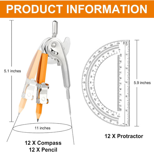 24 Pack Geometry Tool Set, Math Compass for Geometry and 6 Inch Protractor Set Include Metal Compass with Pencil and Clear Plastic Protractor for Student Classroom Office Woodworking Art Drawing