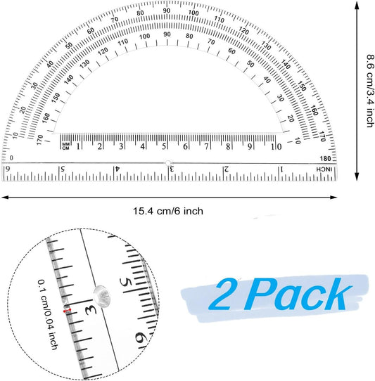 Zonon 2 Pcs 6 Inch Plastic Protractor Math Protractors 180 Degrees Angle Measurement, Translucent for Geometry Classroom Kid Student School Office Supplies(Clear)