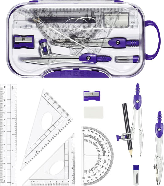 10 Pieces Math Geometry Kit Set Student Supplies with Shatterproof Storage Box,Includes Rulers,Protractor,Compass,Eraser,Pencil Sharpener,Lead Refills,Pencil,for School and Drawings(Purple)
