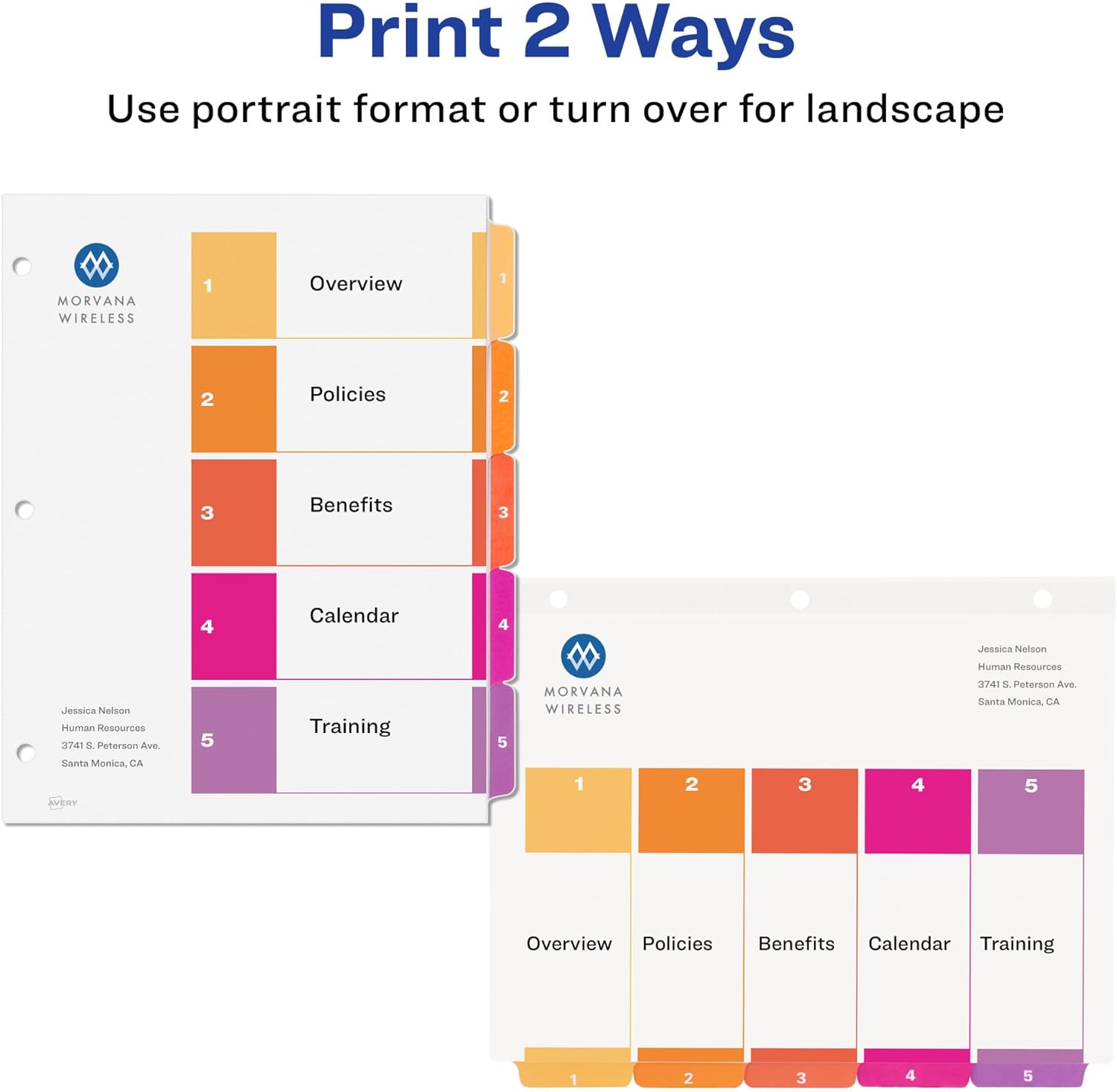 - Multicolor divider tabs are preprinted and don't require labels or inserts