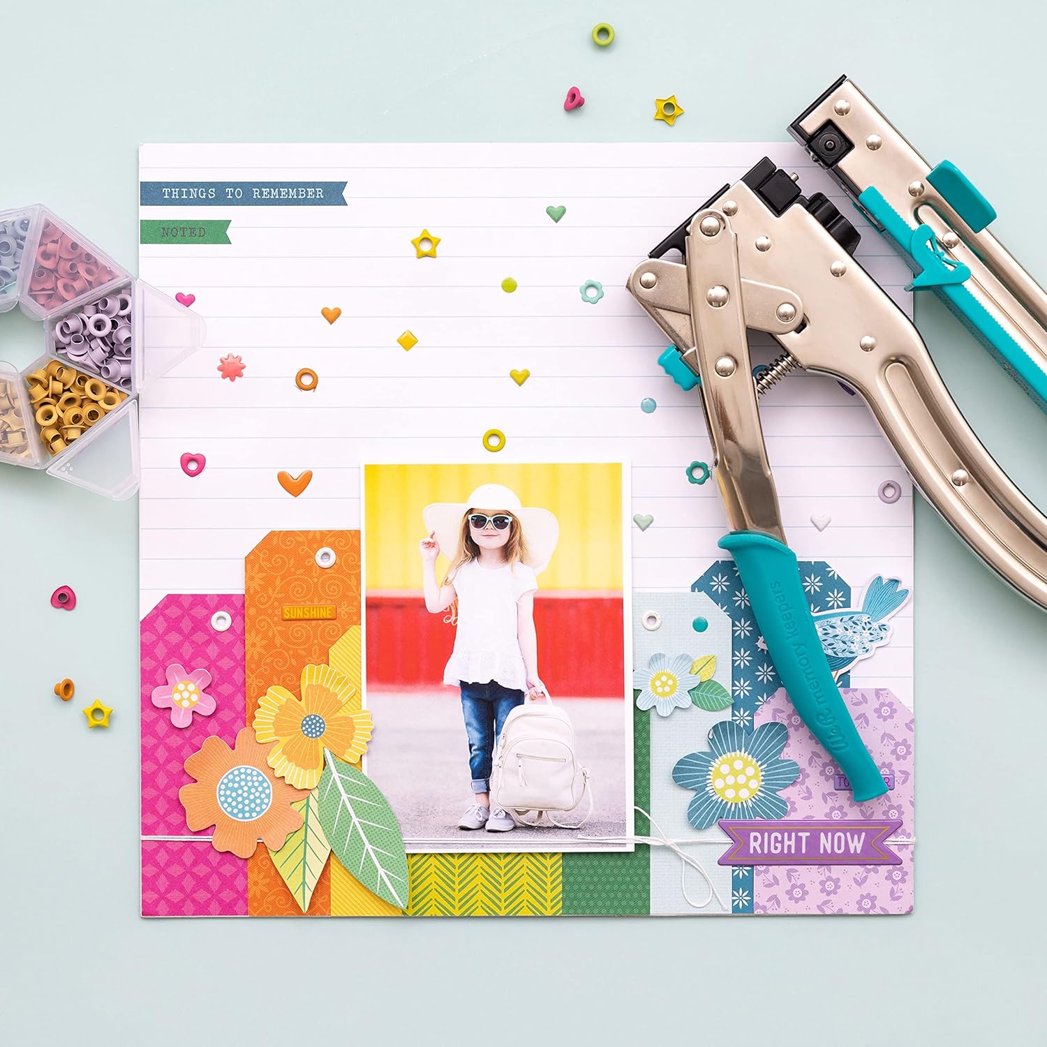 - ALL-IN-ONE TOOL: Punches clean holes at 1/8 and 3/16 of an inch. Setting apparatus allows you to easily lock an embellishment into place. Adjustable measuring guide helps get the perfect measurement every time. Rotating setting cube won’t have you fumbling around for loose pieces.