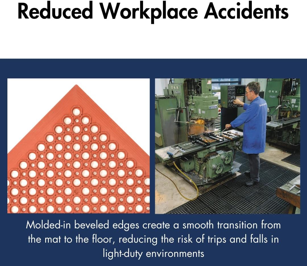 - Increased Workplace Safety - Our anti-fatigue rubber matting with molded-in beveled edges provides a smooth transition from the mat to the floor, ideal for use as commercial kitchen mats