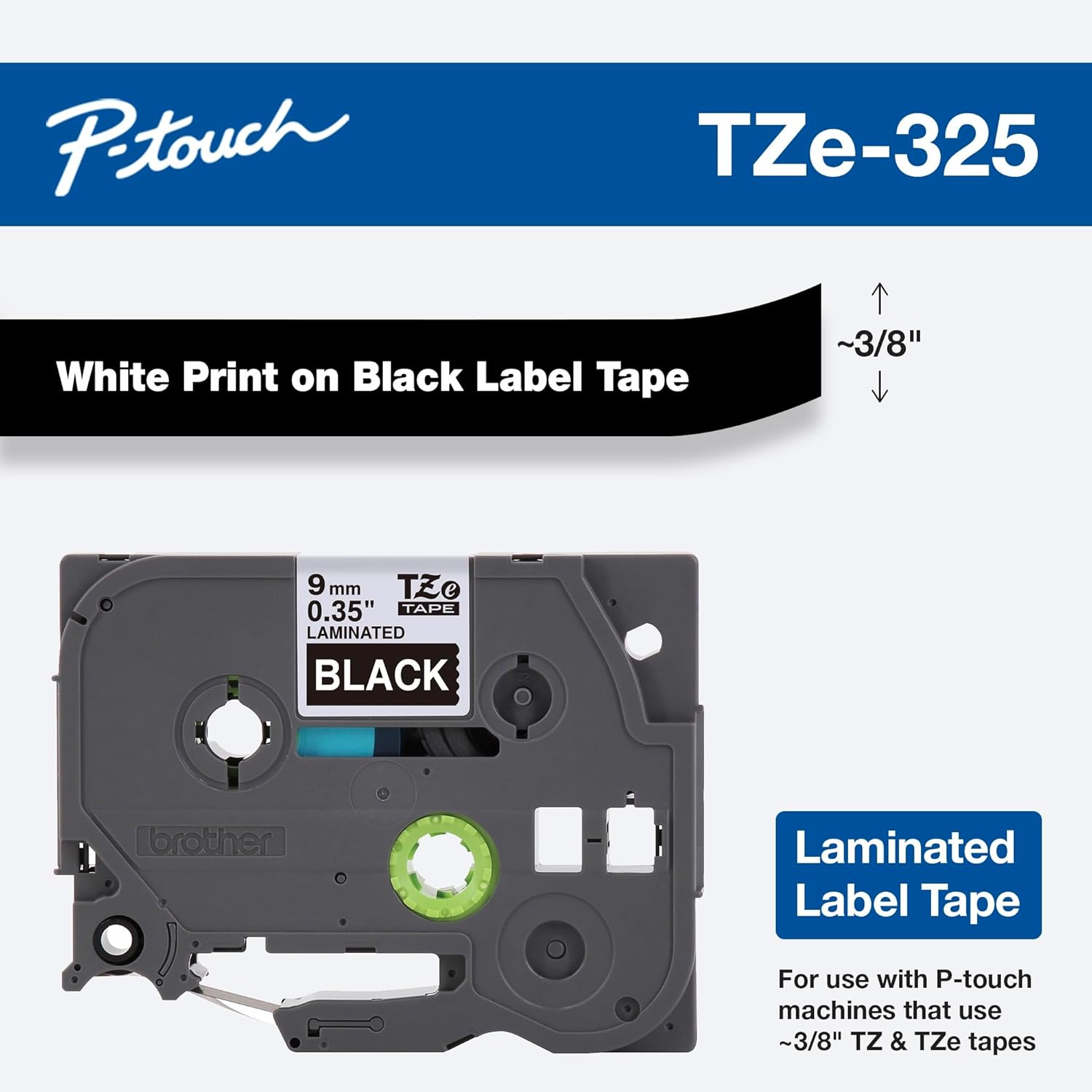 Brother Genuine P-touch TZE-325, 3/8" (0.35") Wide Standard Laminated Tape, White Print on Black Tape, Laminated for Indoor or Outdoor Use, Water-Resistant, 0.35" x 26.2', Single-Pack, TZE325