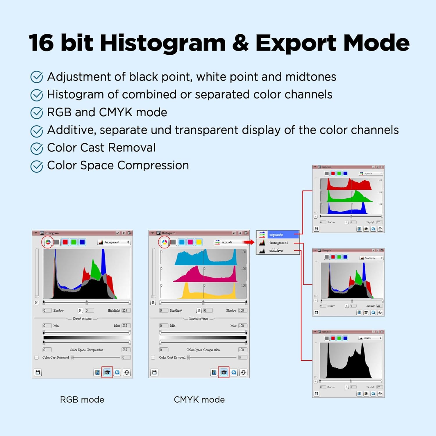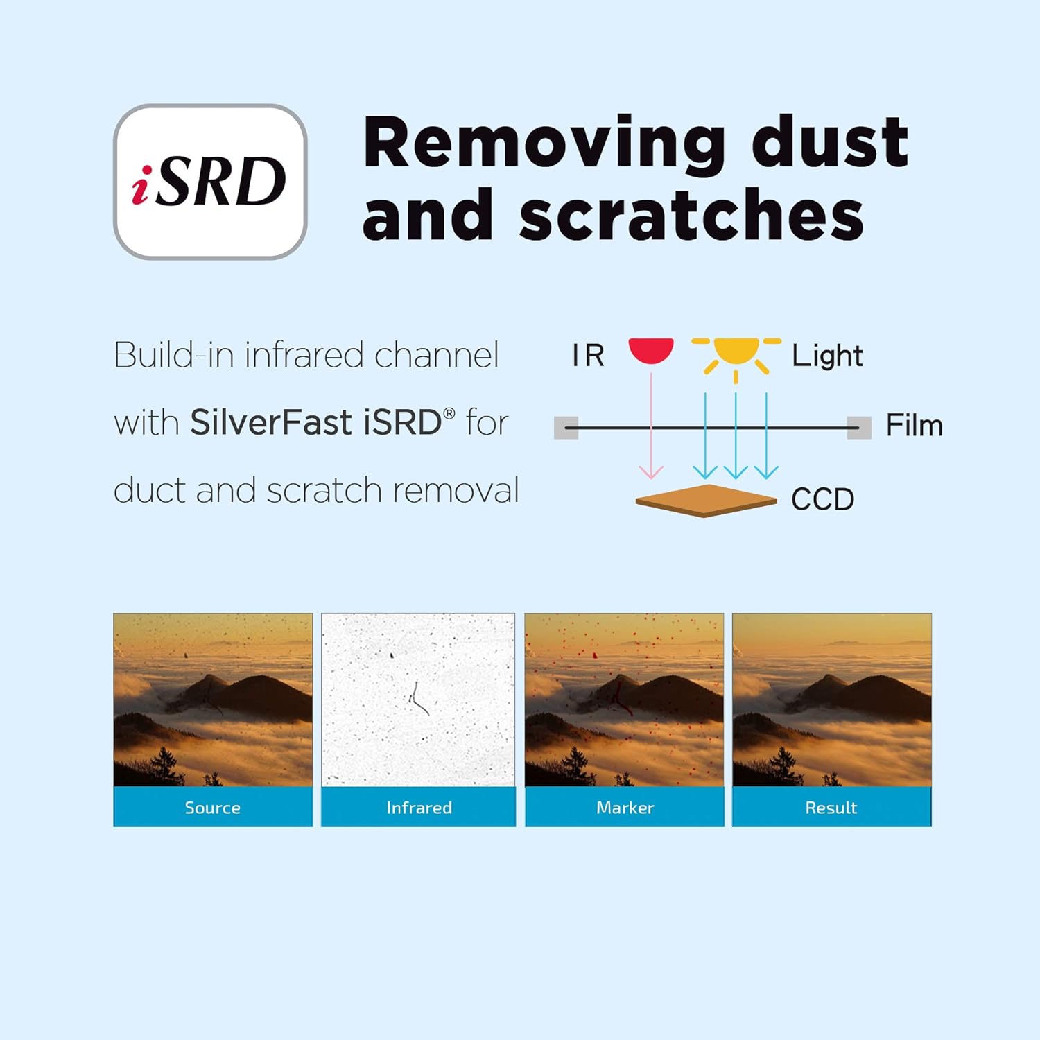 - Built-in infrared channel can detect dust and scratches on the surface of the original negatives and slides. It is highly useful for defect removal without retouching the images. (PS: The scanner's infrared rays cannot permeate through the silver halide layer, so it not works for B/W negatives scanning.)