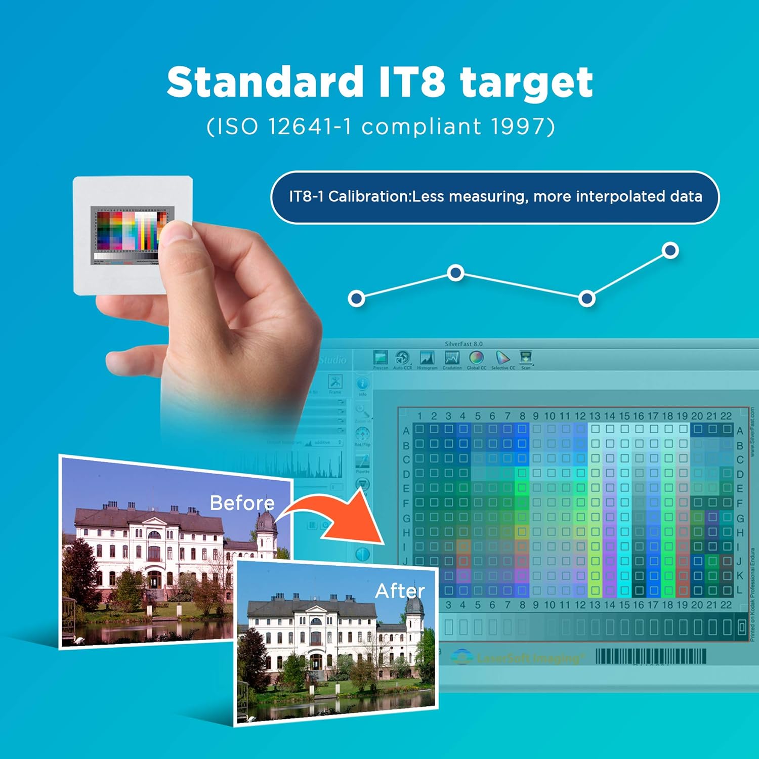 - Standard IT8 Calibration Target (ISO 12641-1 compliant 1997) helps you ensures accurate color results , reducing the need for repeated scans or extensive post processing color correction