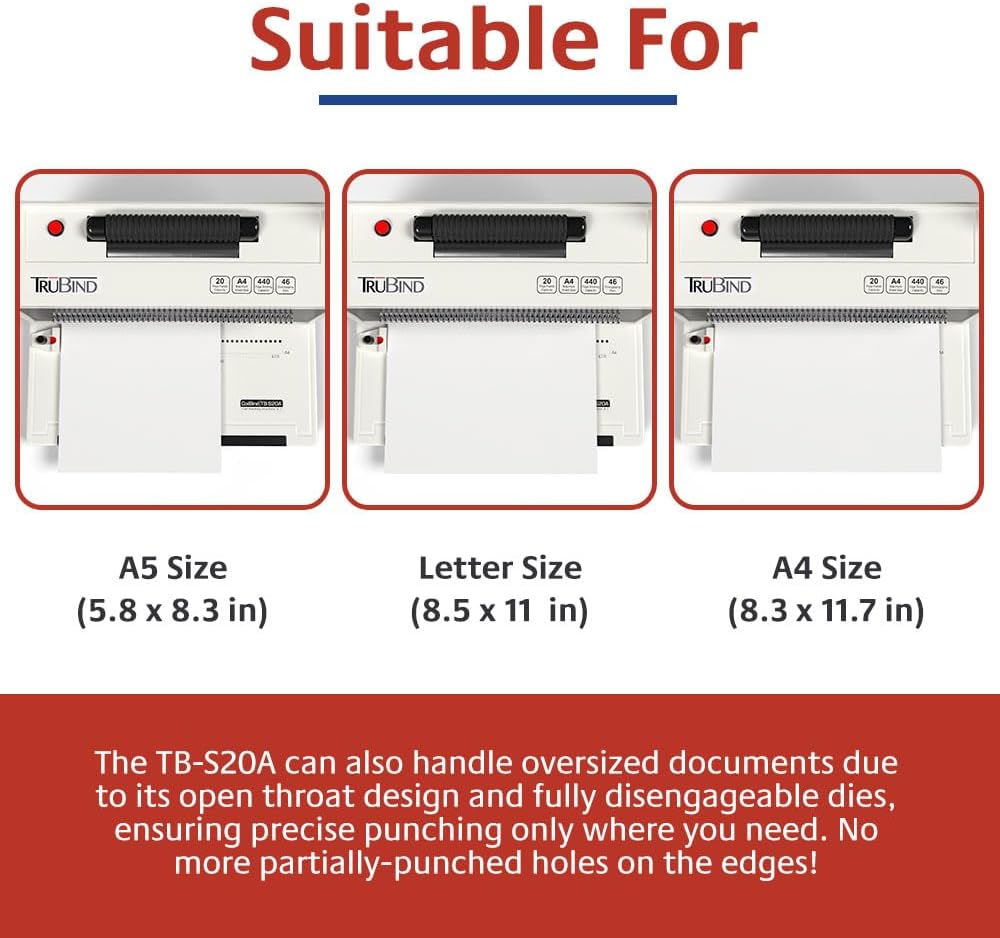TruBind Coil Binding Machine with Electric Coil Inserter and Adjustable Side Margin | 20 Sheet Punch Capacity | Bind up to 440 Sheets | 46 Fully Disengageable Dies | 4:1 Pitch | 2-Year Warranty