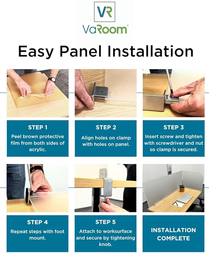 - EASY INSTALLATATION: CLAMP FITS TABLE OR DESKTOP FROM 1/2” to 2 -1/16” THICK. Rubber pads on the clamp and support foot protect your desk and hold divider in place. Reverse clamp and support foot for installation on front or back of work surface. ***Acrylic panel ships with brown protective film, remove film before use.***