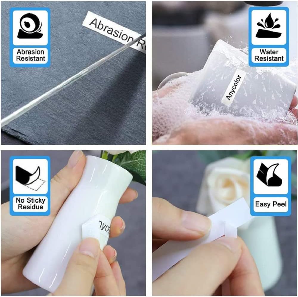 - Anycolor Replacement for P touch TZe tz label tape is ideal to print clear and durable labels. These tapes are easy to install and use. The label has a unique split back making it easy to peel and apply. No sticky residue remains when the labels are removed.