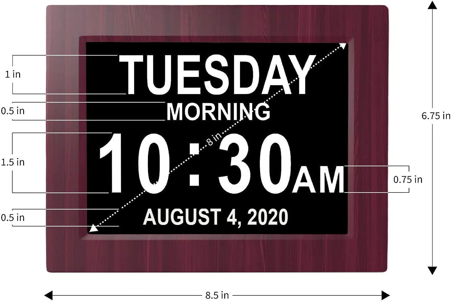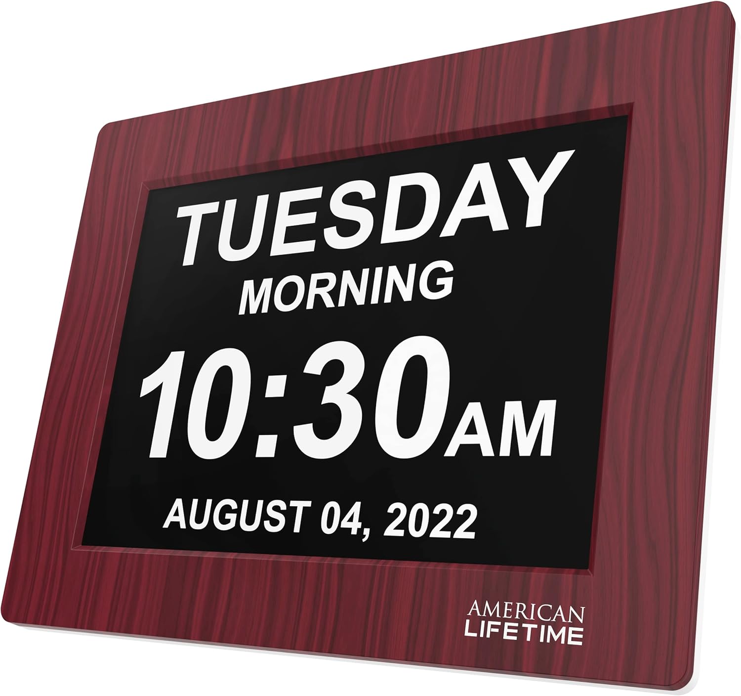 American Lifetime, Upgraded Version, Day Clock Extra Large Impaired Vision Digital Clock with Battery Backup and 5 Alarm Options, Premium Mahogany Color, 8 inch