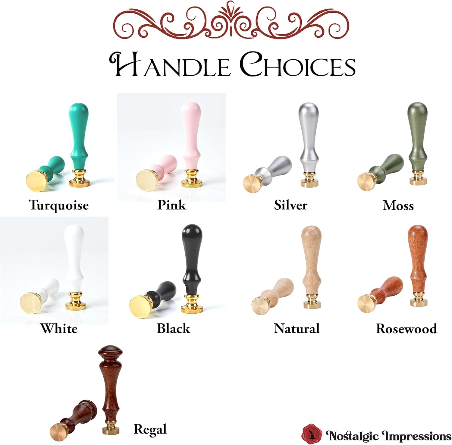 - Removeble Brass head in high quality Brass- the material of choice when it comes to engraving on wax seal stamps. Our Premium brass die improves heat control which reduces stickiness. Brass die face is 1 1/8" in diameter and makes approximately a 1.25" wax seal Wood Handles are 3.5” tall in richly hued colors.