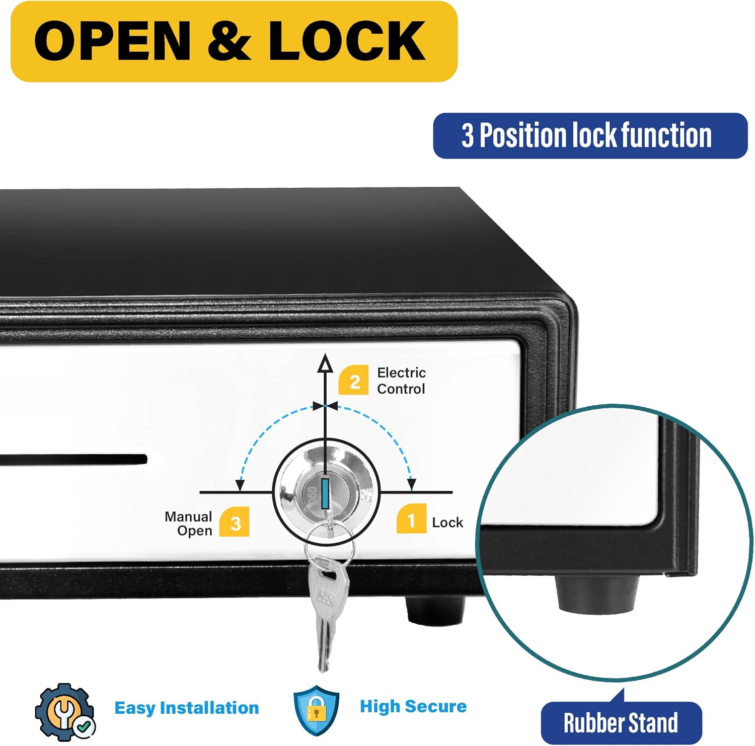 - 💳3-Position Lock& Single Large Front Media Slot: This cash drawer ensures the highest level of security with a 3-position lock mechanism: 1-Lock, 2-Auto Open by Printer/POS, 3-Manual open
