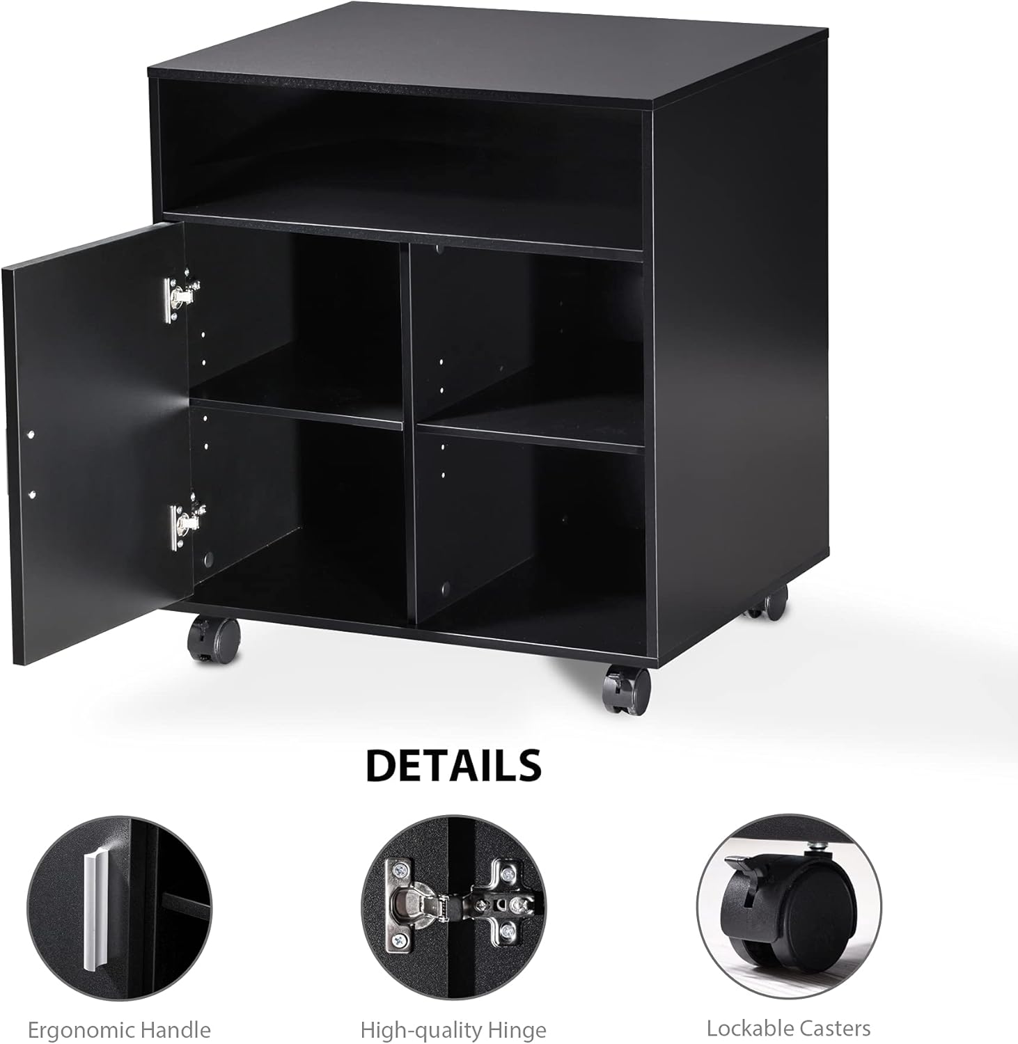 FITUEYES Printer Stand with Storage Adjustable Shelves, Wood Mobile Cart with Door, Rolling File Cabinet on Wheels for Home Office, Black, PS406001WB