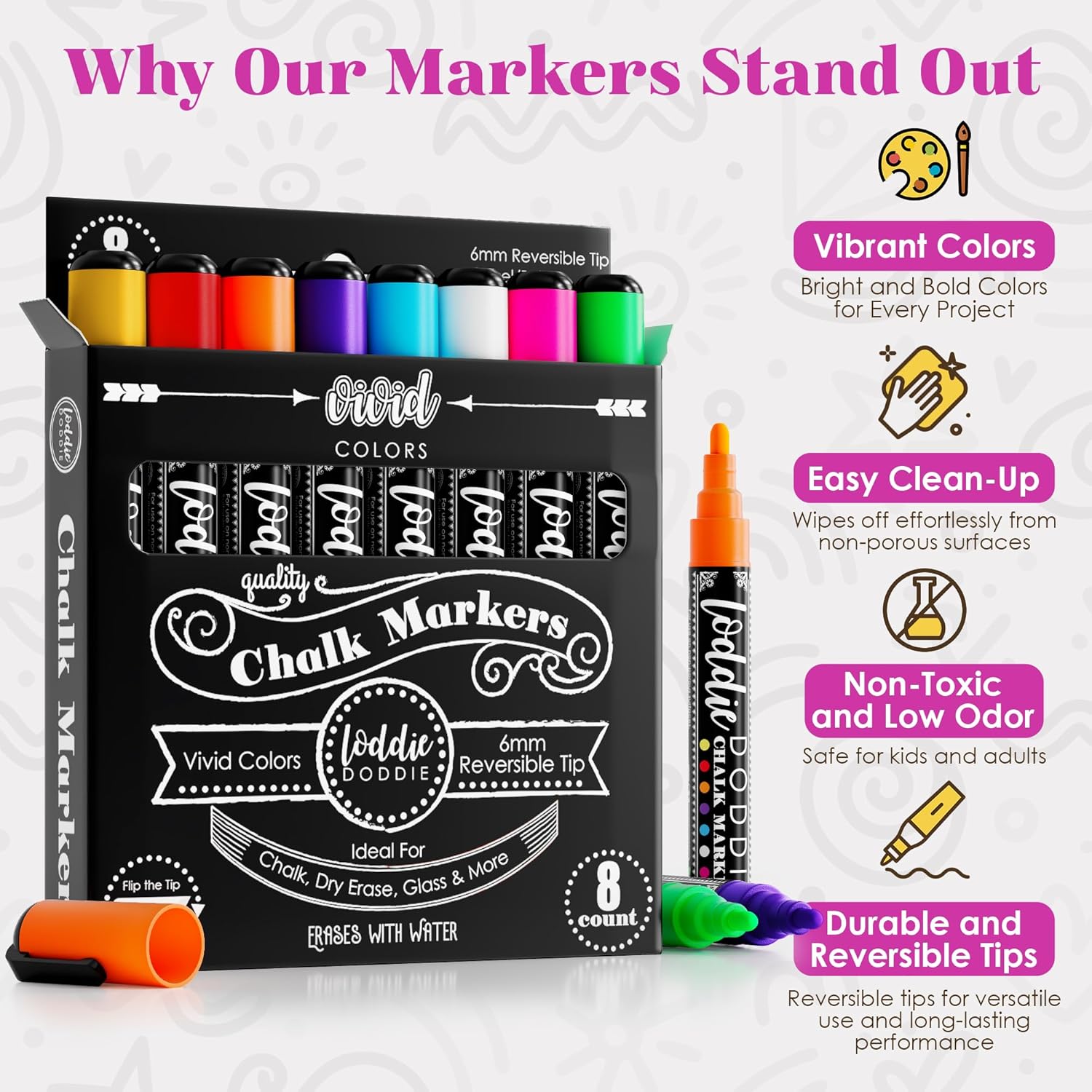 - Express Yourself: Our neon chalkboard markers make your artwork shine. The Loddie Doddie chalk markers for blackboard are Ideal for art projects or organizing holiday storage. These liquid chalk markers for chalkboard use ensure your work stands out clearly on any chalkboard or blackboard. Get creative with these vibrant vivid color chalk markers