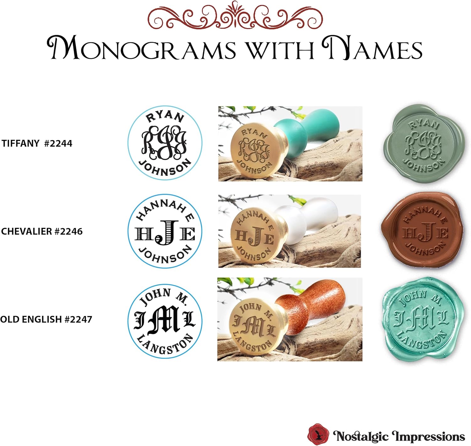 - Custom Monogram Engraving: Your Custom Wax Stamp features your Monogram, and name. Maximum of 14 letters top and bottom, and 3 letter monogram. CLICK CUSTOMIZE NOW BUTTON to create your own layout. Engraved in the USA with State of the Art Laser Engraving offering deep rich details that leaves a clean and concise imprint in wax. Can be used with any sealing wax.