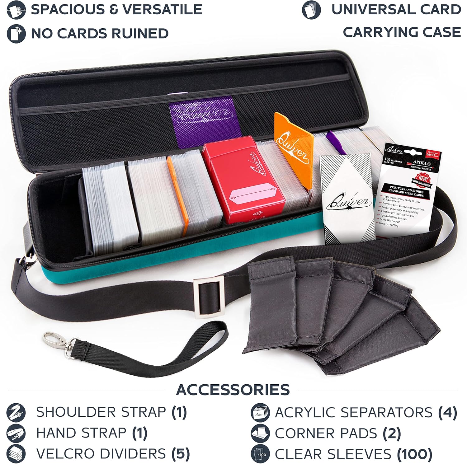 - Deck Box Card Storage Case: The Quiver trading card deck case large capacity cases will fit up to 9 deck boxes, has a convenient mesh pocket to safely store accessories, cushioned corner pads to protect your cards against bending.