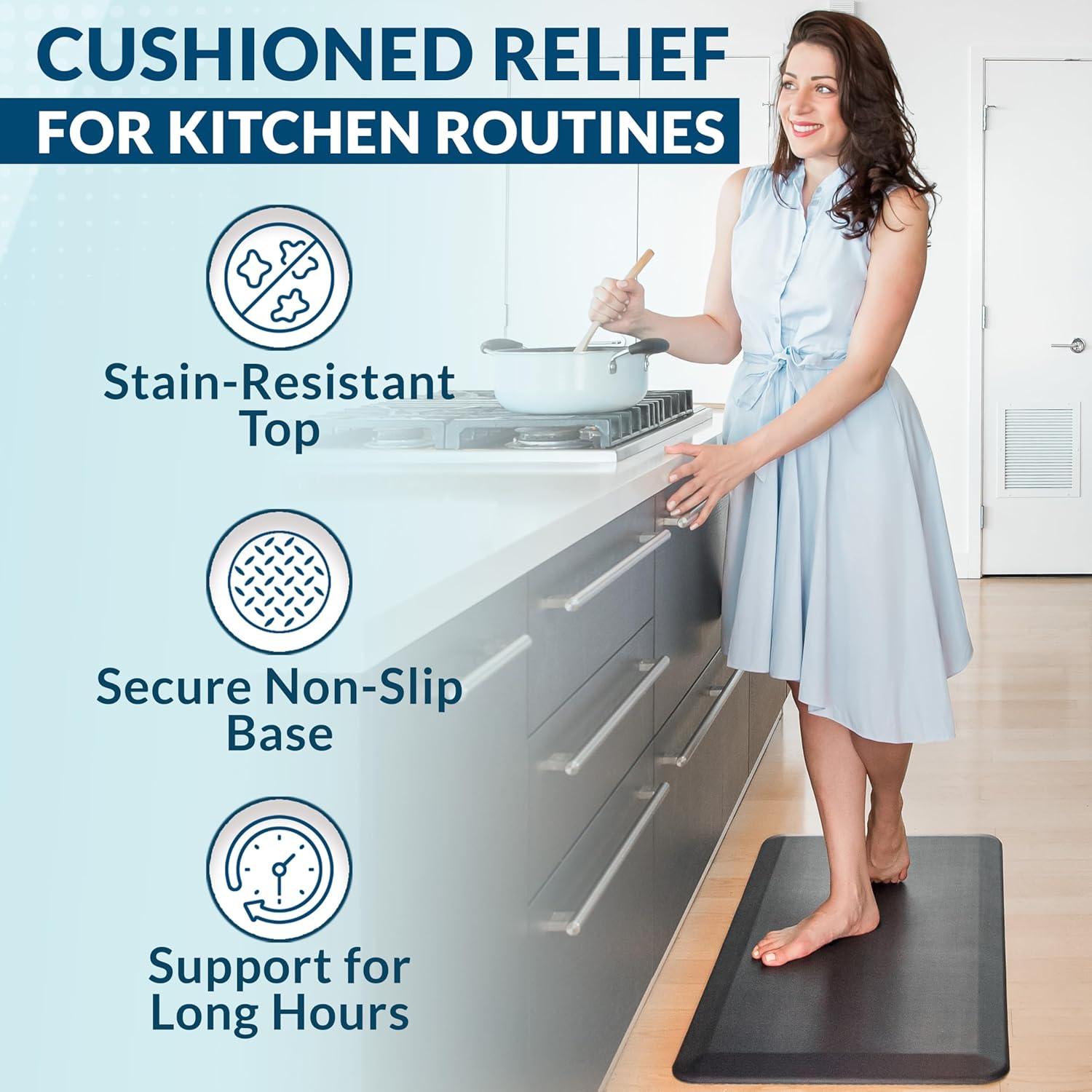 - Slip-Resistant and Stain-Resistant Surface: Stay safe and clean with our anti fatigue mats for kitchen floor that feature a non-slip backing to keep it securely in place. The stain-resistant material is easy to clean and ensures your mat looks new, even with daily use.