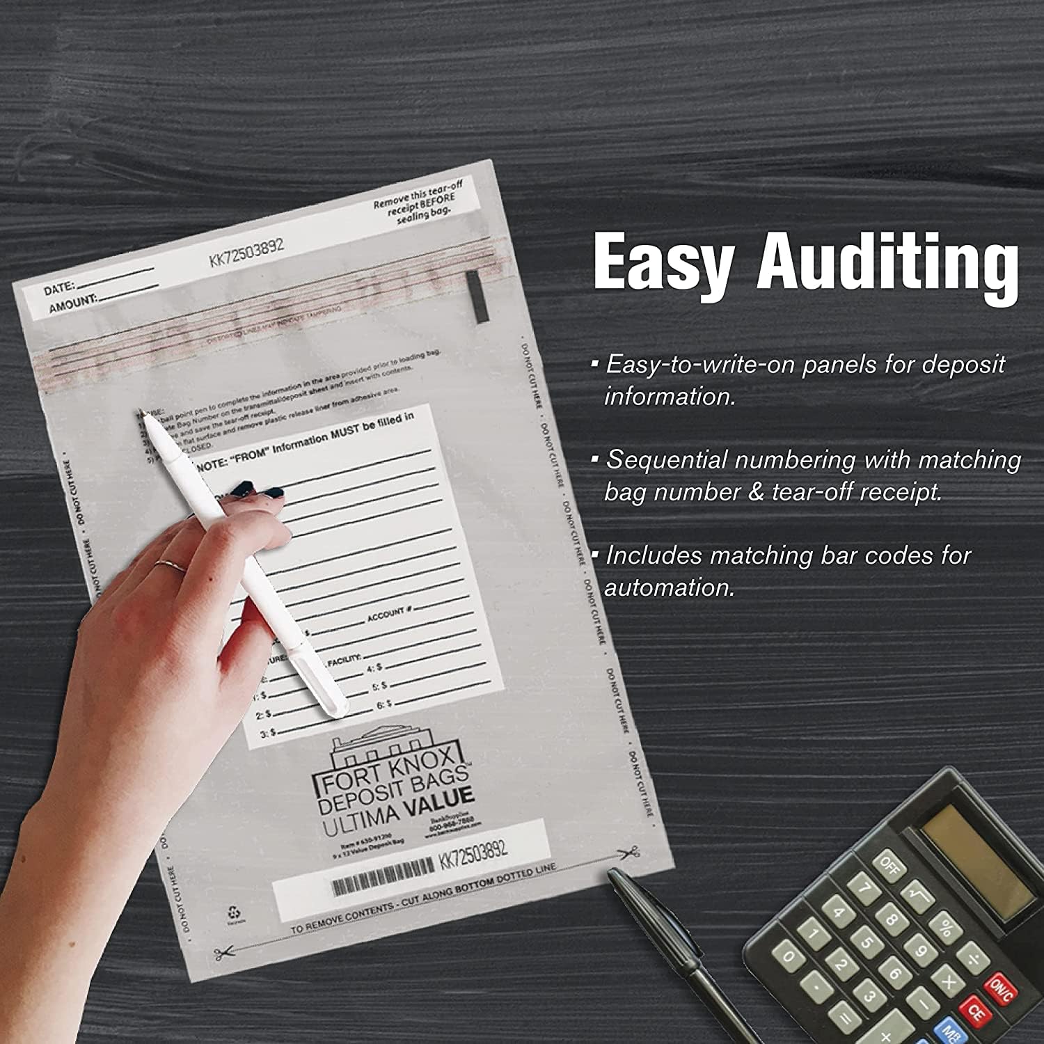 - DURABLE SECURITY DETECTION: Approved by major banks and credit unions that require see-through to contents. Utilize the sequential numbering with matching bag number and tear off receipt, and matching bar codes for automation.