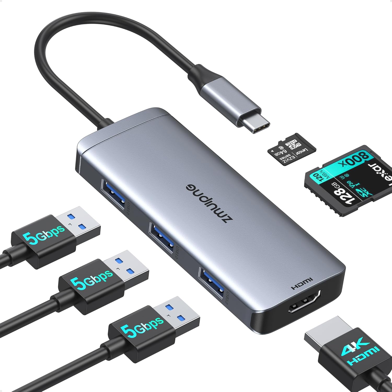 - 6 IN 1 USB C Dongle Adapter for MacBook Air: ZMUIPNG Mac Adapter easily fulfill your daily use by extending one USB C port from your thunderbolt 3/Type C devices to 4K@30hz HDMI, SD/Micro SD Card reader, 3 x USB 3.0 ports without install device, plug and play. Please note: This product does not support Apple Super Drive.