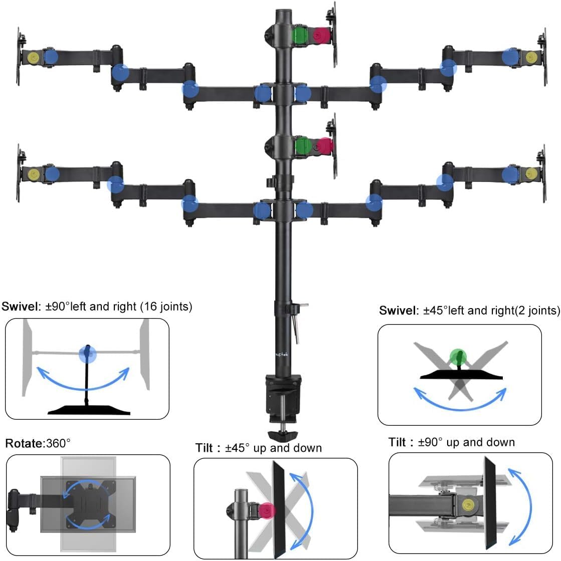 - Fully aticulation - Rotate 360°, tilt ±90° up and down, swivel ±90° left and right (middle plates tilt ±45° up and down, swivel ±45° left and right), extra tall height adjustment along the center pole.
