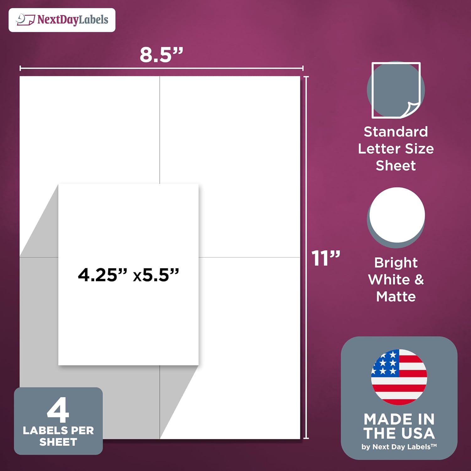 NextDayLabels - Laser/Ink Jet White Labels (4-1/4" x 5-1/2" - 4 Per Page | 100 Labels)