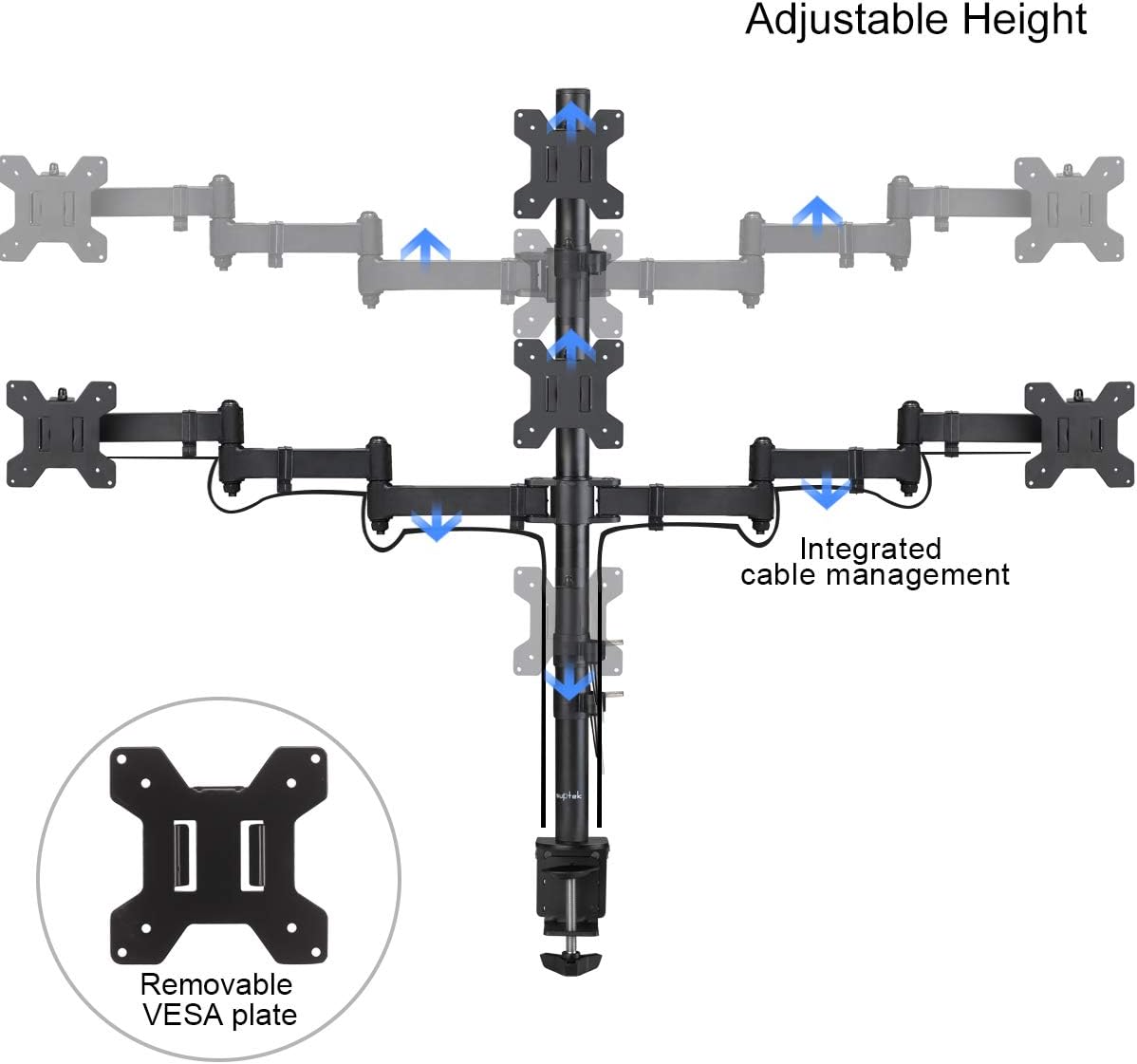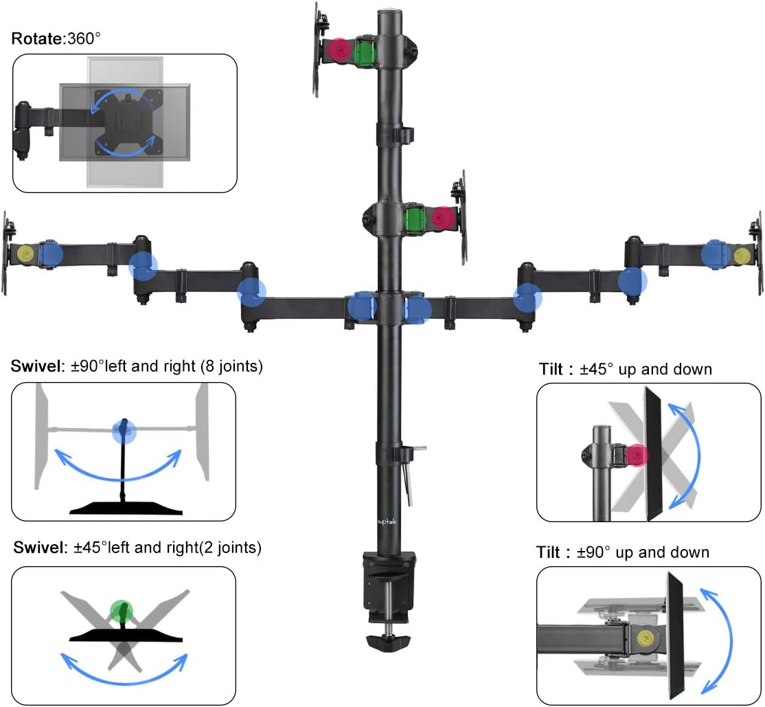 - Fully aticulation - Rotate 360°, tilt ±90° up and down, swivel ±90° left and right (middle plates tilt ±45° up and down, swivel ±45° left and right), extra tall height adjustment along the center pole.
