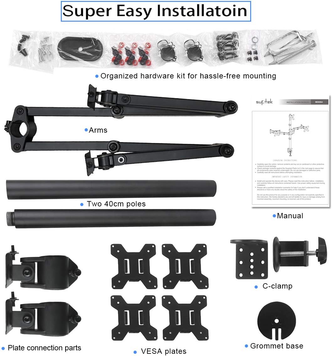 Suptek Quad LED LCD Monitor Stand up Desk Mount Extra Tall 31.5 inch Pole Heavy Duty Fully Adjustable Stand for 4 (3+1) / Four Screens up to 27 inch (MD6864)