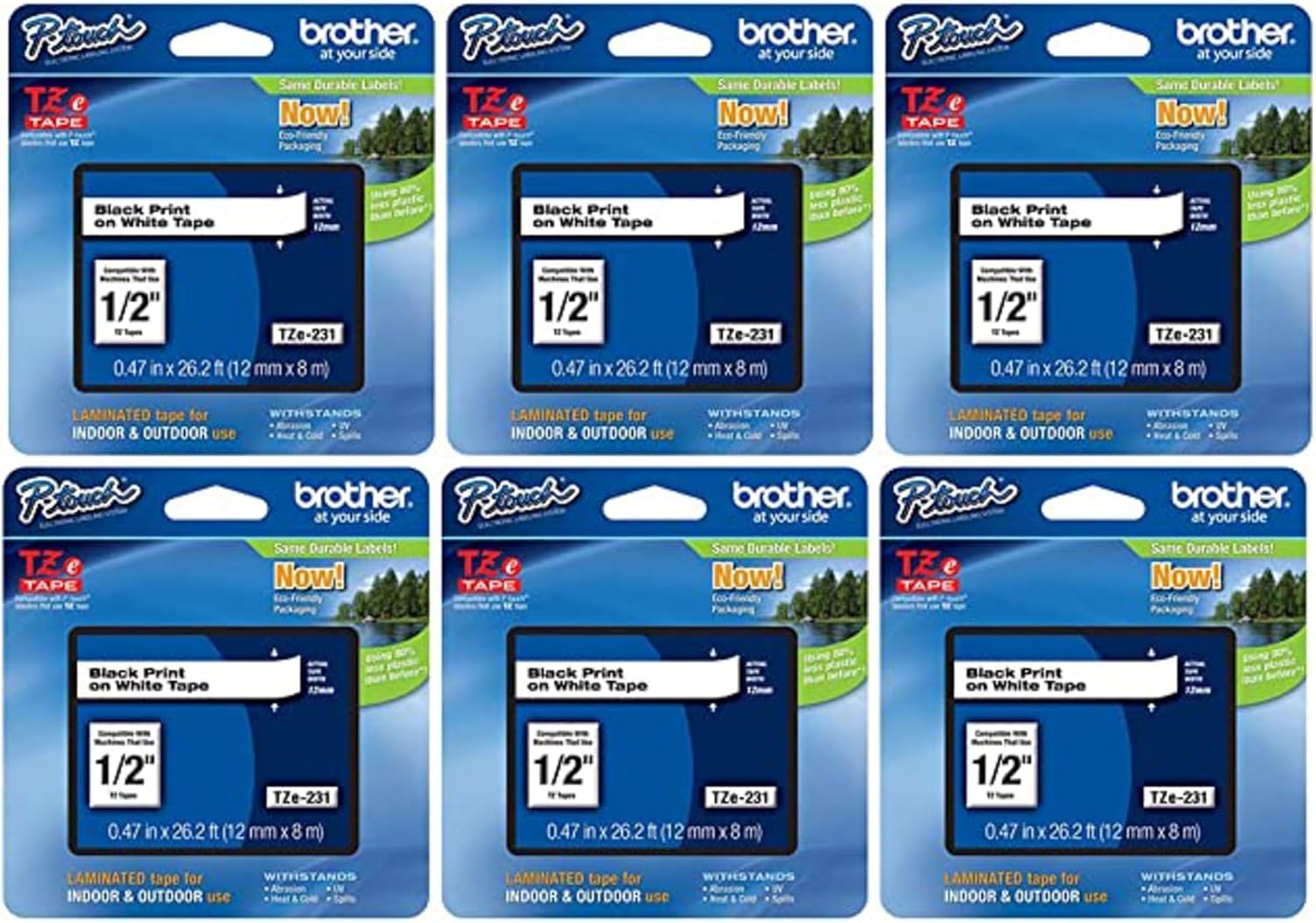 Brother Genuine P-Touch, TZe-231 6 Pack Tape ½” (0.47”) x 26.2 ft. (8m) 6-Pack Laminated P-Touch Tape, Black on White, Perfect for Indoor or Outdoor Use, Water Resistant, TZE2316PKB (TZE231)