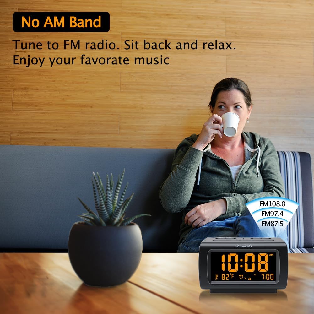 DreamSky Alarm Clock Radios for Bedrooms with Battery Backup, Large Big Numbers with Brightness Dimmer, USB Port, Bedside Digital FM Radio with Sleep Timer, Temperature, Adjustable Volume, Snooze