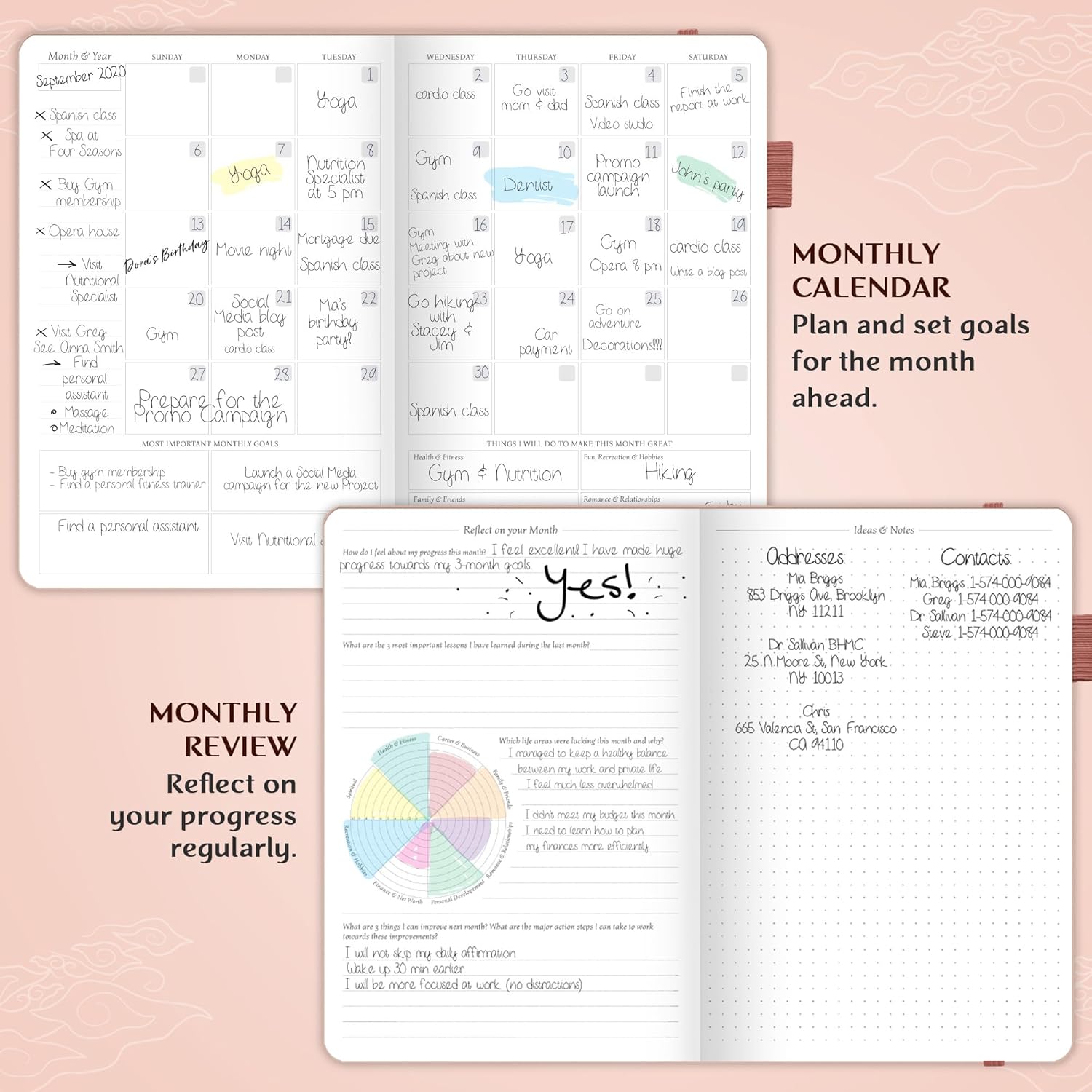 - A5 SIZE, STICKERS & USER GUIDE – This planner organizer comes in A5 size (5.8x8.3 inches), with an eco-leather hardcover, thick 120gsm paper, lay-flat binding, pen loop, elastic band, 3 bookmarks, pocket for notes, 3 sheets of stickers, and user guide.