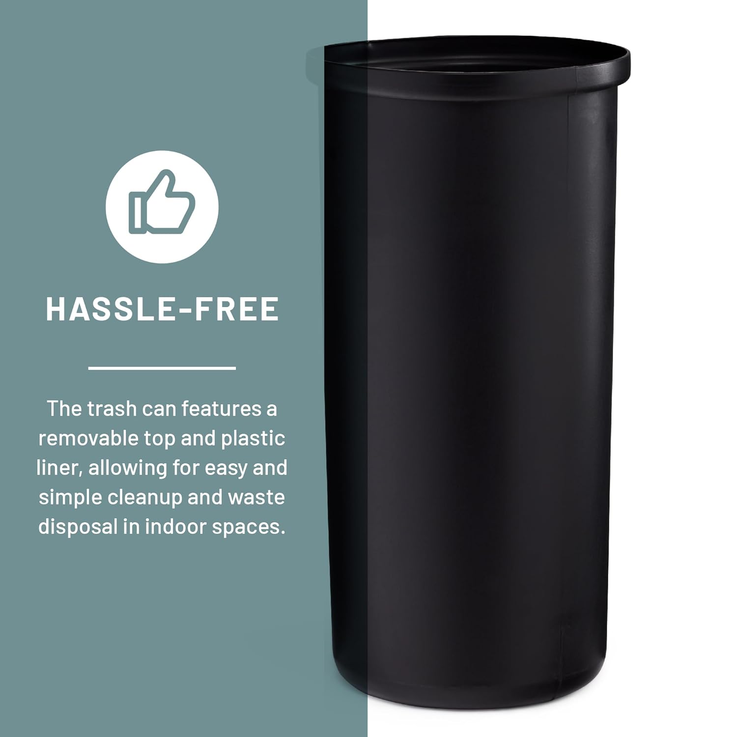 - REMOVABLE LID AND LINER. Lid hides unsightly trash bag and easily removes to reveal a peel-resistant rigid plastic liner for easy maintenance.