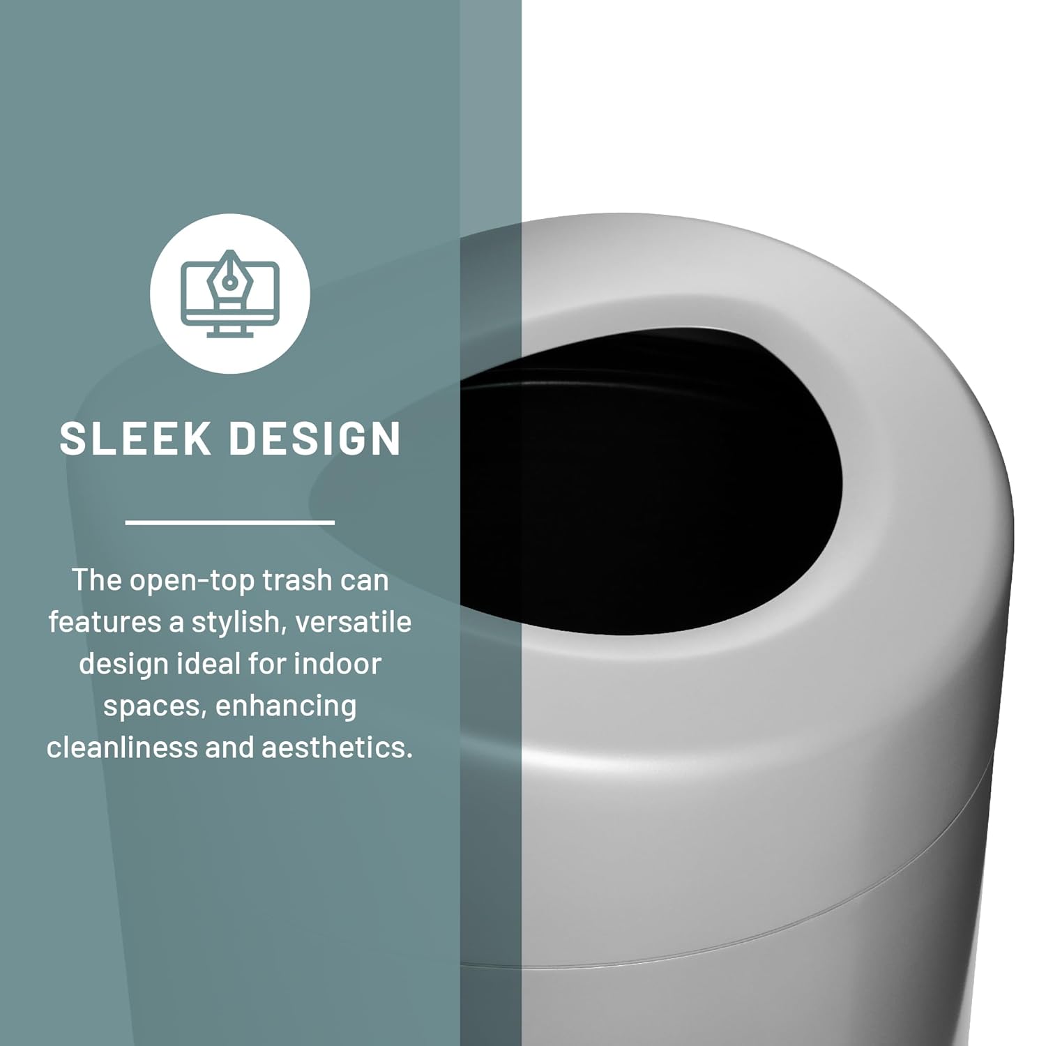 - MODERN STYLING. Safeco Open Top Trash Receptacle with Liner combines contemporary styling with hands-free disposal to create a high capacity trash can ideal for offices, lobbies, reception areas and entryways.