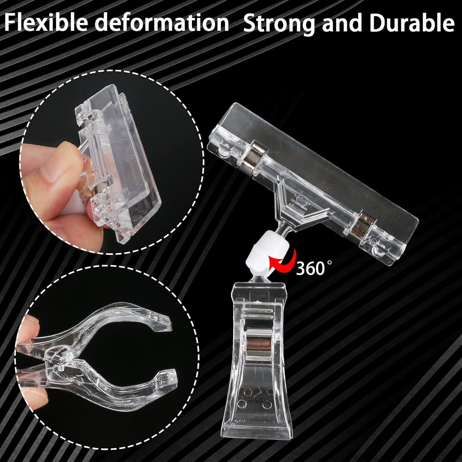 Mlici 16 Pieces Clear Sign Clips, Plastic Merchandise Rotatable Pop Clip Sign Holder Stand, Swivel Clips Clothing Rack Signs, Double Display Clips for Retail, Baskets, Cards
