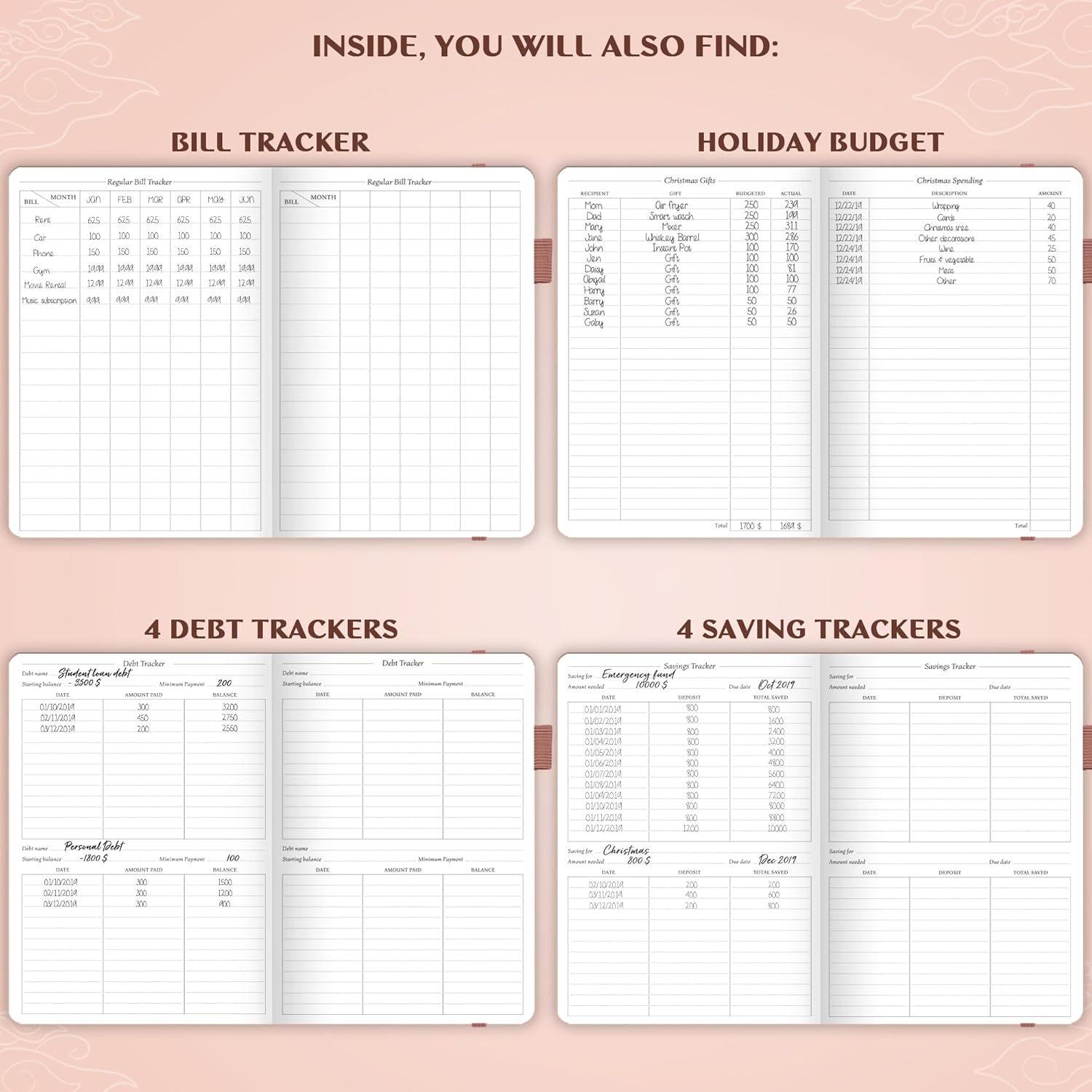 - MASTER EFFICIENT BUDGETING, SAVING & DEBT MANAGEMENT – At the back of the budget book, you will find 8 savings and 12 debt trackers, a holiday budget, and a regular bill tracker.