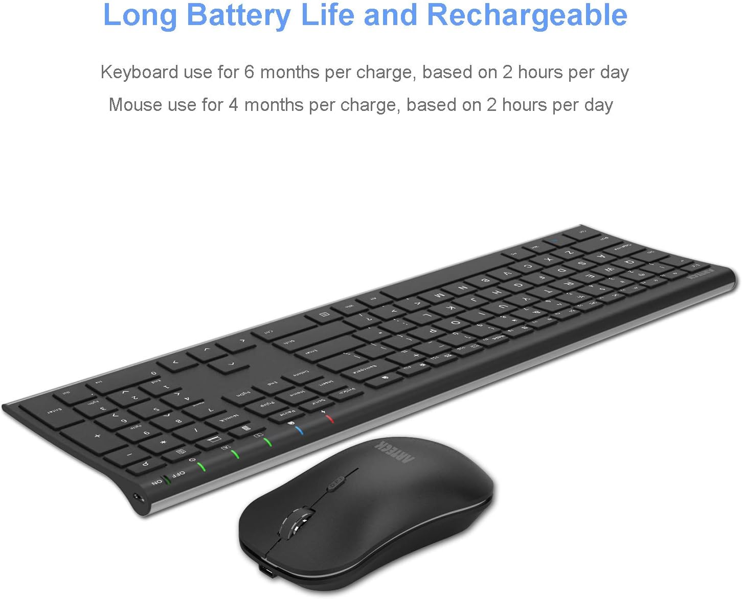 - Long Life Rechargeable Battery: Rechargeable lithium battery with an industry-high capacity lasts for 6 months for the keyboard and 4 months for the mouse with single charge (based on 2 hours non-stop use per day).