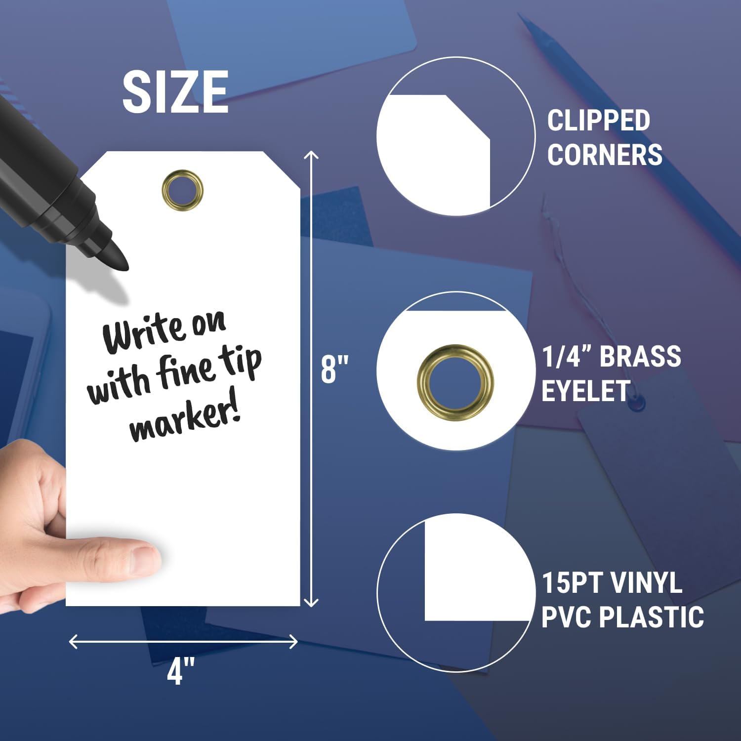 Tags 4 Less 15 Mil Waterproof Plastic Tags, Pack of 100 – 4” x 8” Heavy Duty Plastic Tags for Labeling, Outdoor Tagging, Equipment Labeling, Luggage, Valves & More (White)