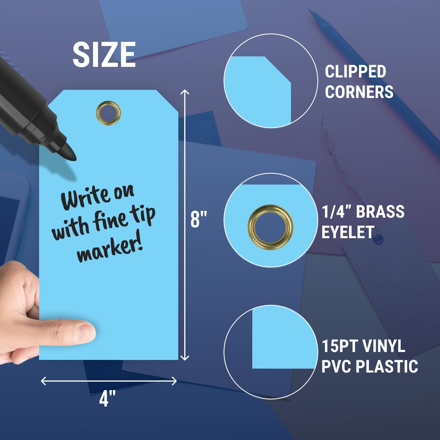 Tags 4 Less 15 Mil Waterproof Plastic Tags, Pack of 100 – 4” x 8” Heavy Duty Plastic Tags for Labeling, Outdoor Tagging, Equipment Labeling, Luggage, Valves & More (Light Blue)