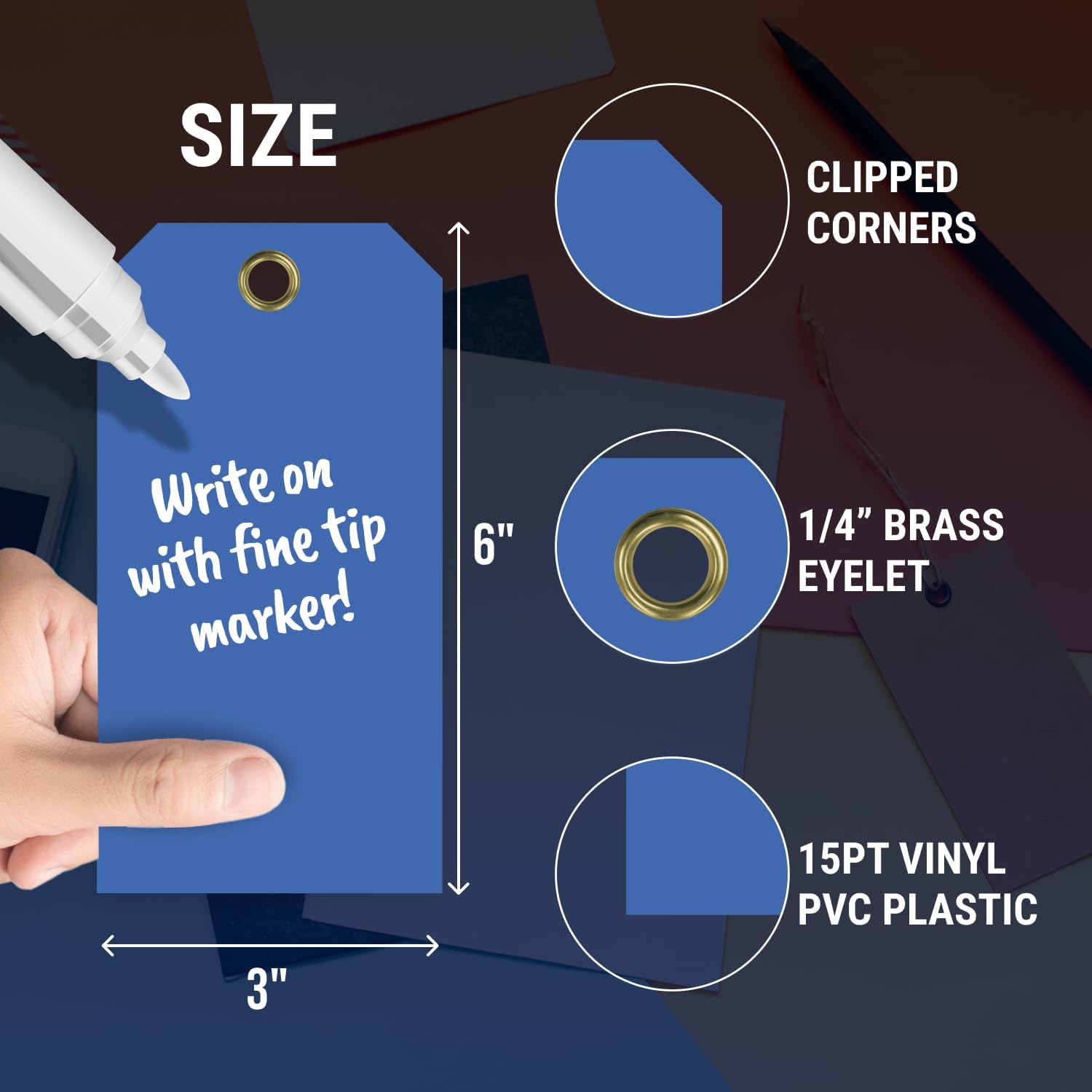 Tags 4 Less 15 Mil Waterproof Plastic Tags, Pack of 100 – 3” x 6” Heavy Duty Plastic Tags for Labeling, Outdoor Tagging, Equipment Labeling, Luggage, Valves & More (Dark Blue)