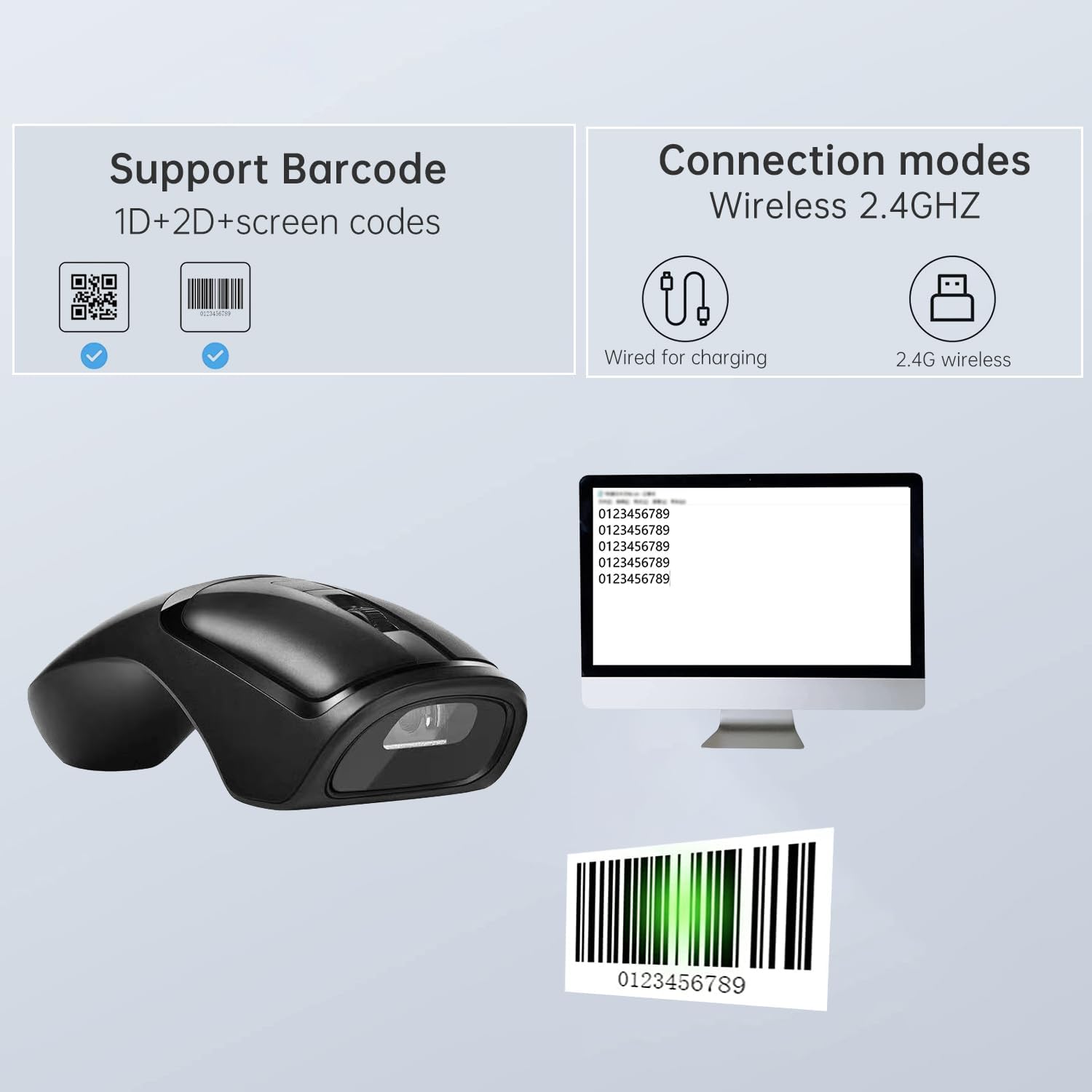 - With Wireless Barcode Scanner and Wireless Mouse Double Functions,Take It Up As a Scanner,Put It Down As a Mouse.Switch Freely, Convenient and Fast. (PS: if can't turn on the scanner or the scanner beeps continuously, please use the USB cable to charging scanner!)
