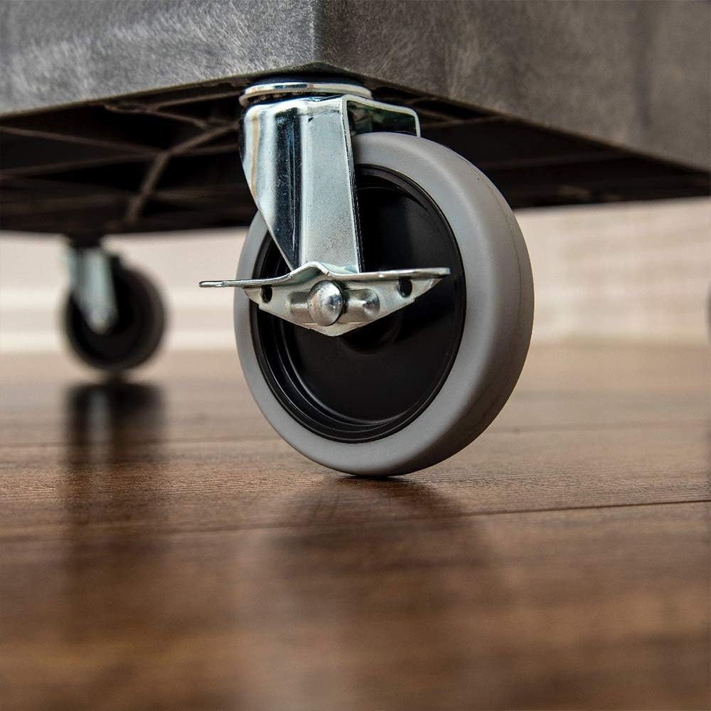 - Molded plastic shelves and legs will never rust dent scratch or stainHDPE (high-density polyethylene) shelves; PVC square legsShelves safely transport goods in 2.5" deep tub areaErgonomic push handle molded into top shelfFour 4" full-swivel casters with two locking brakes; available with 5" heavy-duty castersHolds up to 400 lbs. (500 lbs. with heavy-duty casters)Available in black and grayMade in the USADimensions:Overall dimensions: 27.25" W x 18" D x 36.25" HShelf dimensions: 24" W x 18" DTray depth: 2.5"Clearance between shelves: 10.5ΓÃ
