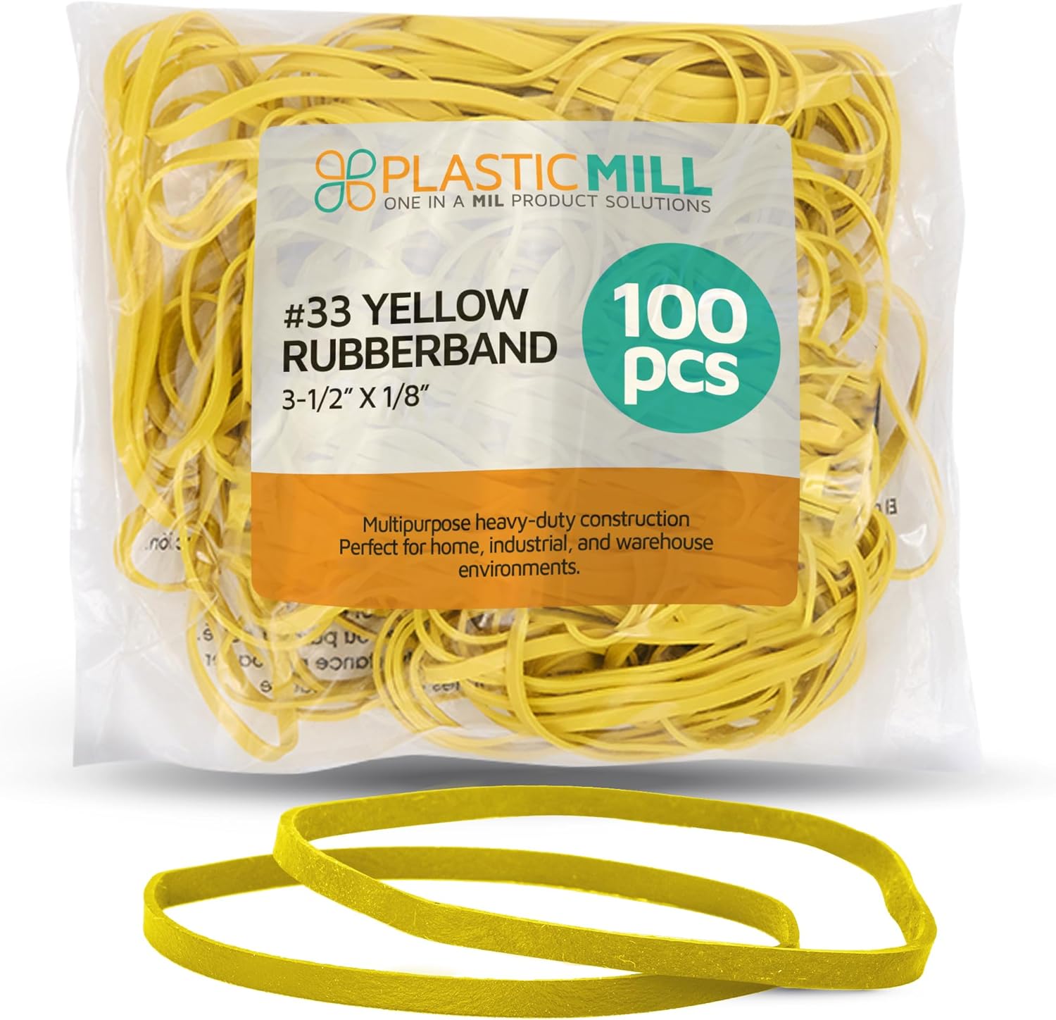 Plastic Mill Rubber Bands Thick Size #33 | Yellow Durable RubberBands 100 Count /pack | 3 1/2 x 1/8" Multi-Purpose Band | Elastics large Long Rubber for Office Supply, File Folders, box, Books, gifts, Notebook|