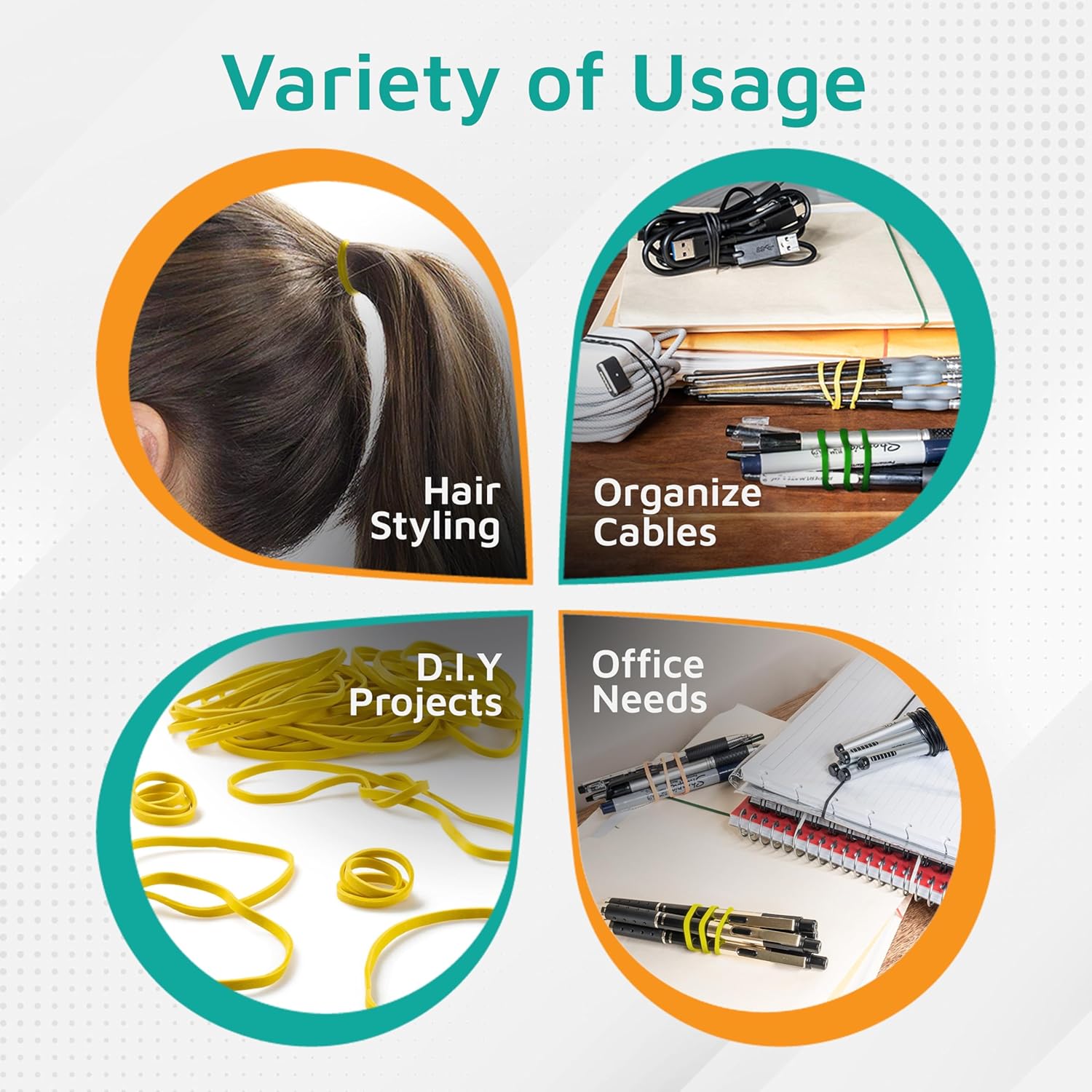 - Soft stretch: These rubber bands have a soft stretch making them comfortable to use and handle. Perfect for everyday use: Ideal for organizing papers and sealing bags at home or in the office.