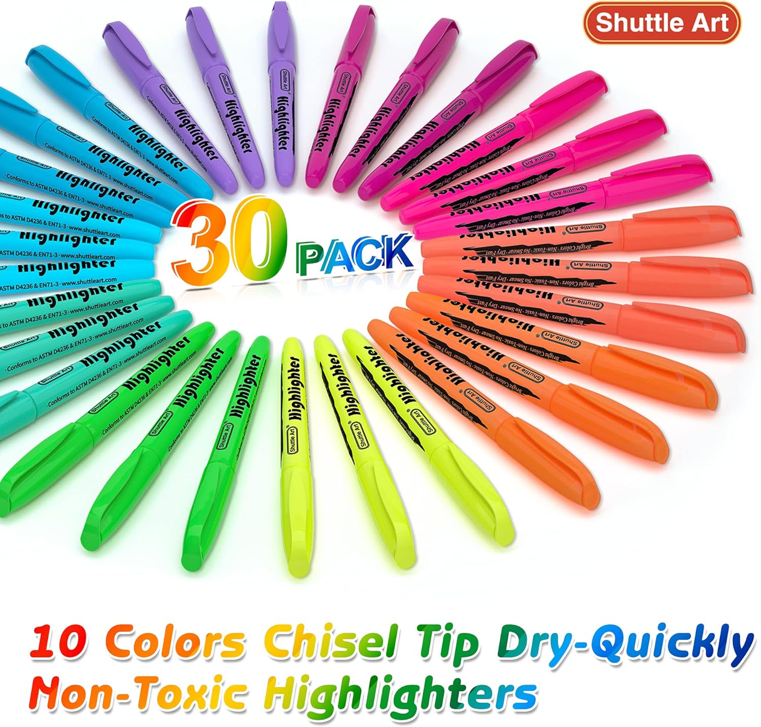 Shuttle Art Highlighters, 30 Pack Highlighters Assorted Colors, 10 Colors Chisel Tip Dry-Quickly Non-Toxic Highlighter Markers for Adults Kids Highlighting in Home School Office