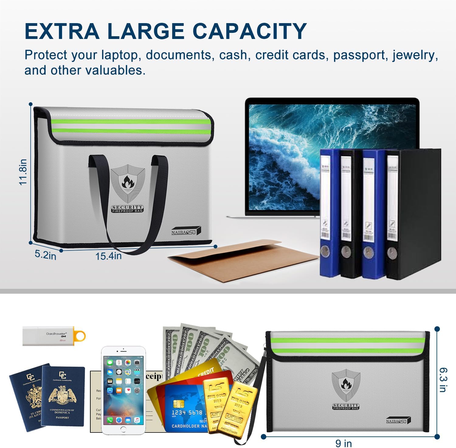 - Large Capacity & Foldable Fire Safe Box :Includes 2 security bags with 16 x 12 x 5 inches capacity and 8.75 x 6 inches capacity to easily hold your valuables such as laptops, documents, certificates, photos, money, jewelry and more. The fire safety bag expands to 7 inches wide, giving you plenty of space.The folding design allows it to be easily stored in a fireproof safe, storage cabinet, or drawer.