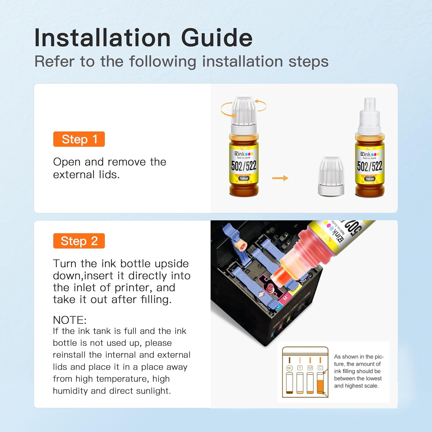 E-Z Ink Compatible Refill Ink Bottle Replacement for Epson 502 T502 522 T522 High Yield to use with ET-4760,ET-3760,ET-2760,ET-3710,ET-2750,ET-3700 Printer (Black, Cyan, Magenta, Yellow, 4 Pack)