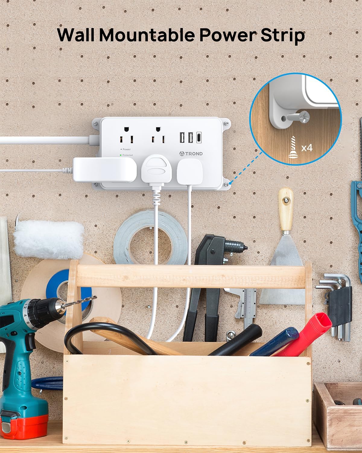 - Wall Mount Power Strip: This wall mountable power strip is a screw mountable design. Four screw-mounting tabs allow you to securely install this power strip and easily be reached, including behind the TV, workbench, garage, bedside, bathroom, laundry room, or under desk or cabinet, which is very low-profile and saves desktop space for you