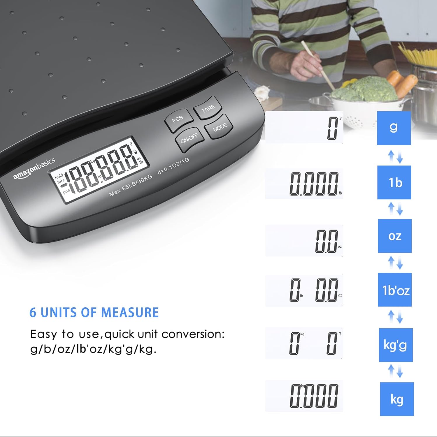 Amazon Basics Digital Postal Scale, AC Adapter, 65 lb Capacity, 0.1 oz Readability, Black