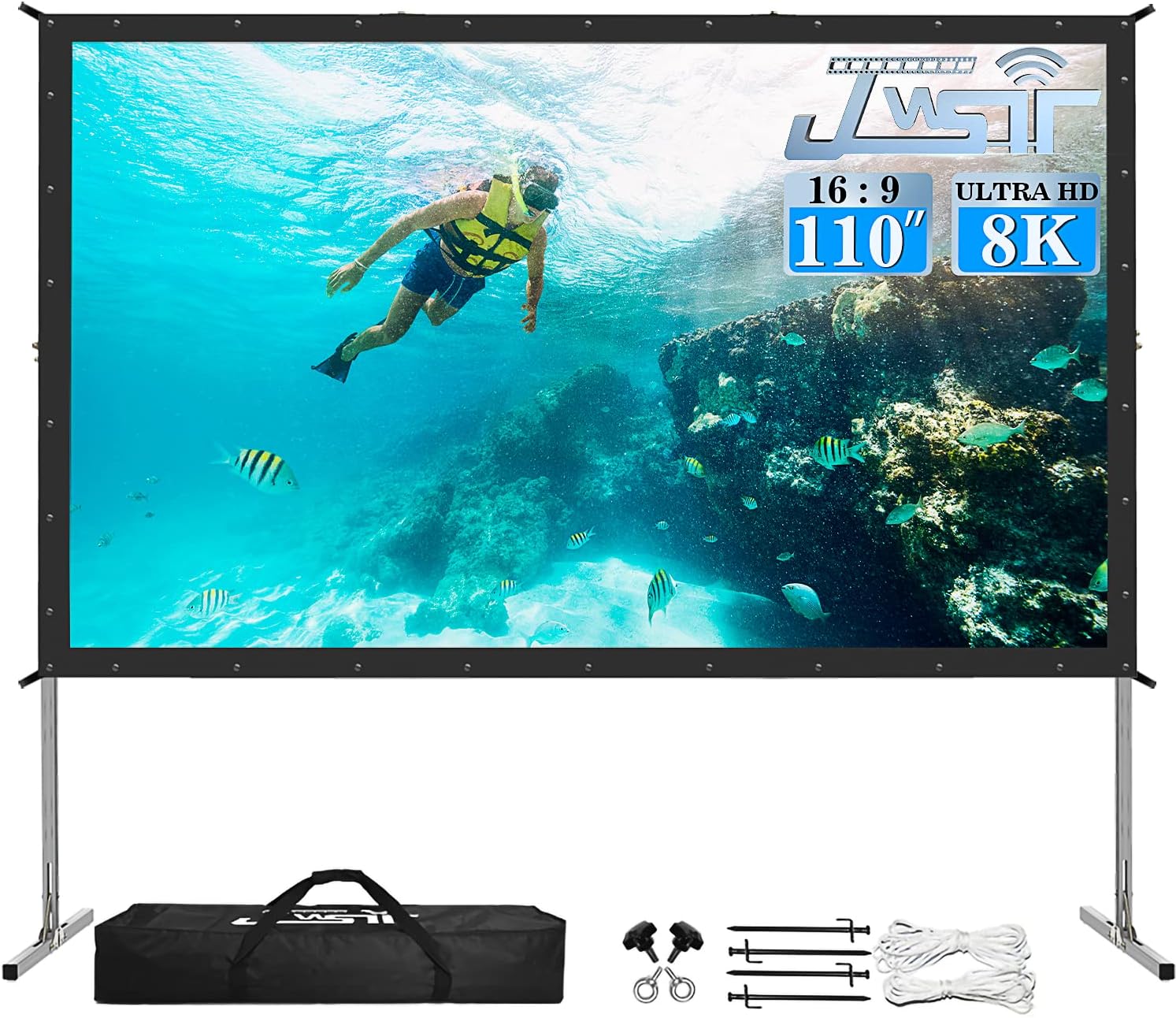 Projector Screen and Stand,JWSIT 110 inch Outdoor Movie Screen-Upgraded 3 Layers PVC 16:9 Outdoor Projector Screen,Portable Video Projection Screen with Carrying Bag for Home Theater Backyard