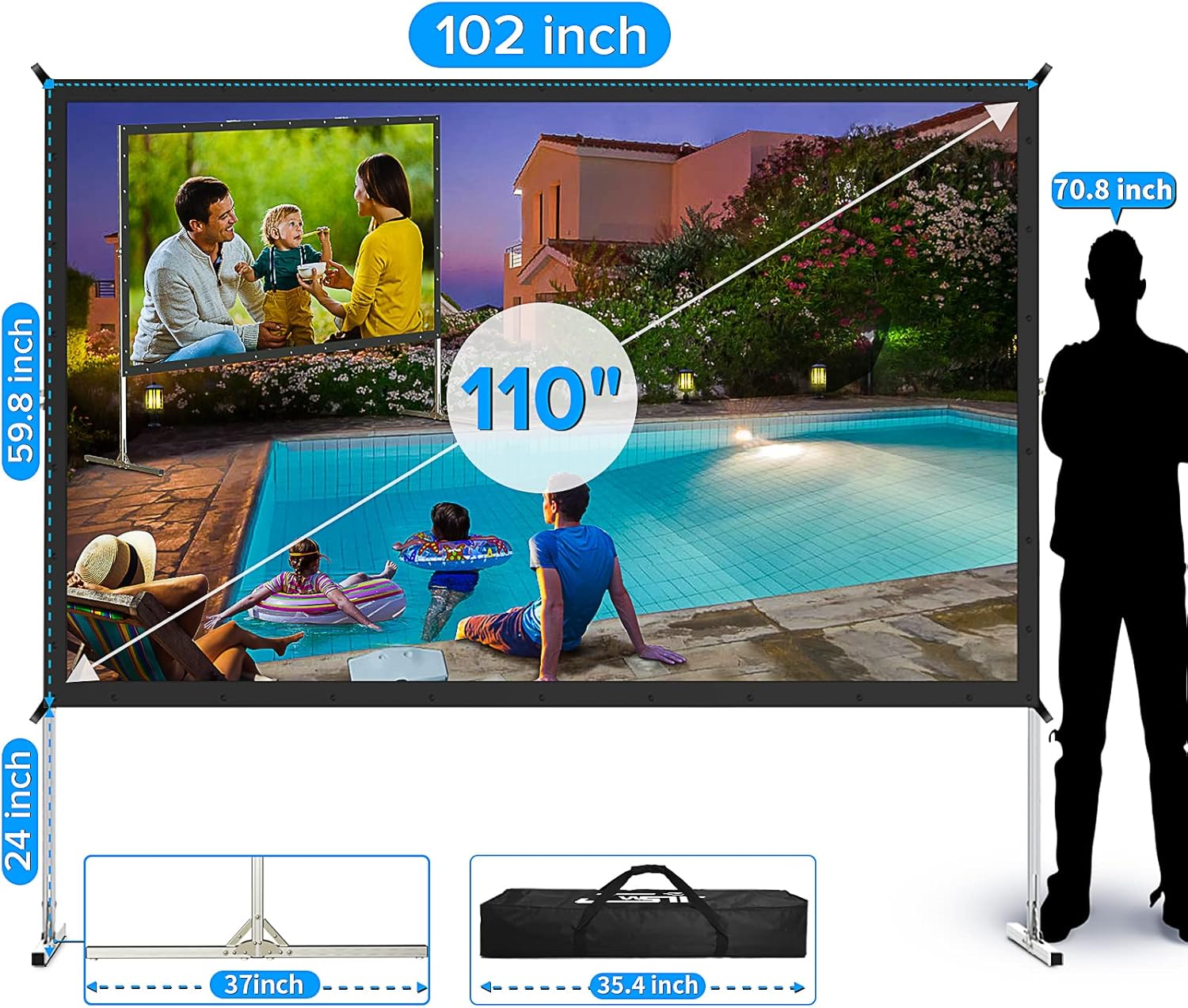 - ▶【Convenient to Carry】The projector screen made by lightweight but sturdy aluminum, the portable movie screen frame can be easily transported to anywhere with included soft padded carrying bag and be well protected. The 110" outdoor movie screen folds super compactly than most 4K HD projector screensthat make it easy to travel along with for family trips, camping, or backyard movie night ect.