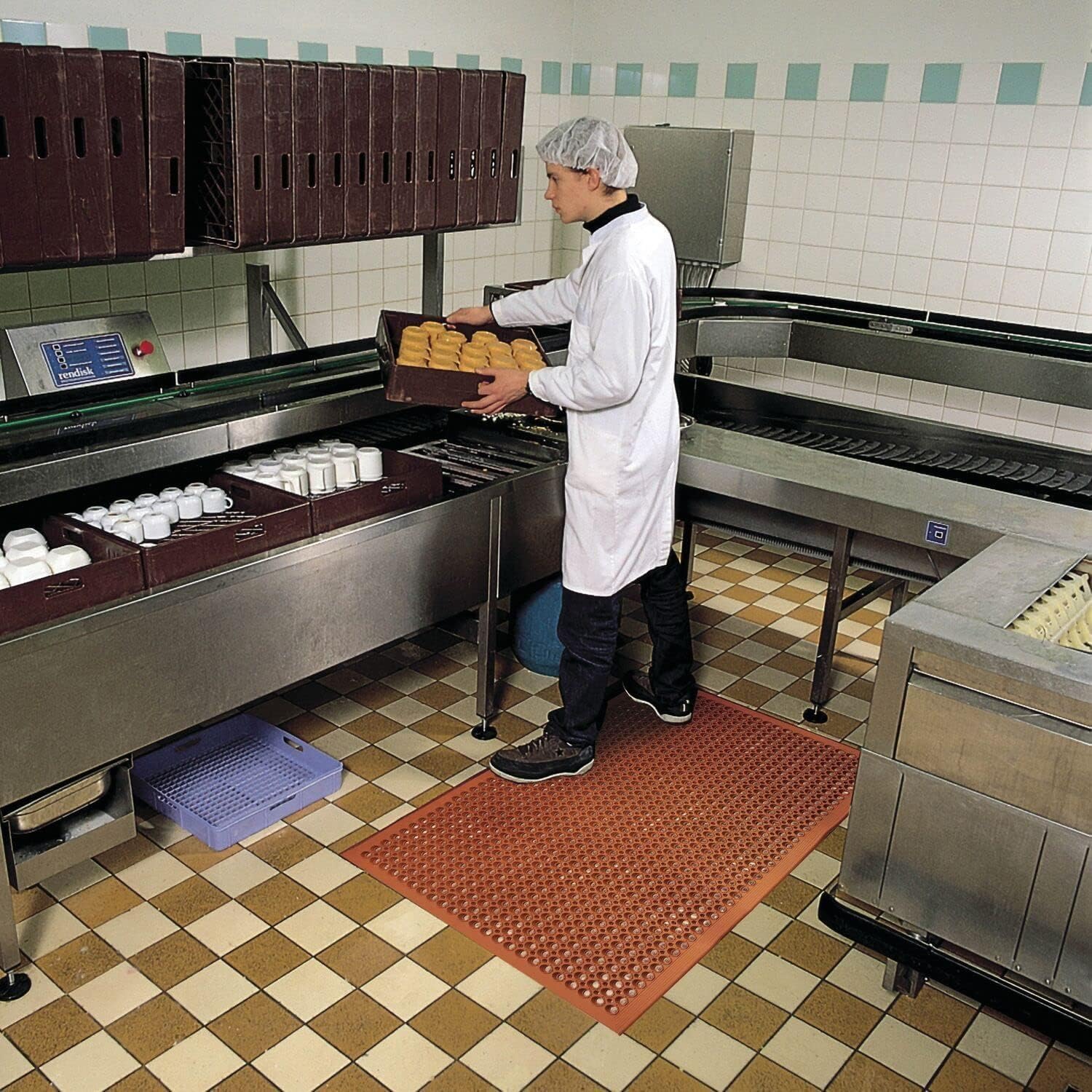 - Increased Workplace Safety - Our anti-fatigue rubber matting with molded-in beveled edges provides a smooth transition from the mat to the floor, ideal for use as commercial kitchen mats